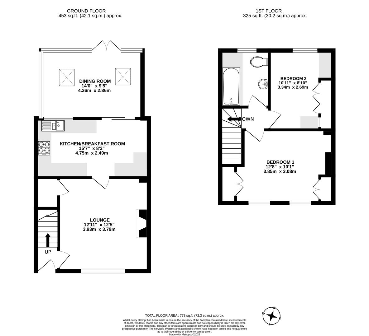 On the first floor, the landing provides access to the loft space. The generous primary bedroom includes built-in wardrobes and a front-facing double-glazed window. Bedroom two is also a spacious double with bespoke built-in storage and a rear-facing double-glazed window overlooking the garden. The modern, fully tiled bathroom includes an enclosed bath with shower over, wash basin, WC, and a rear-facing double-glazed window.