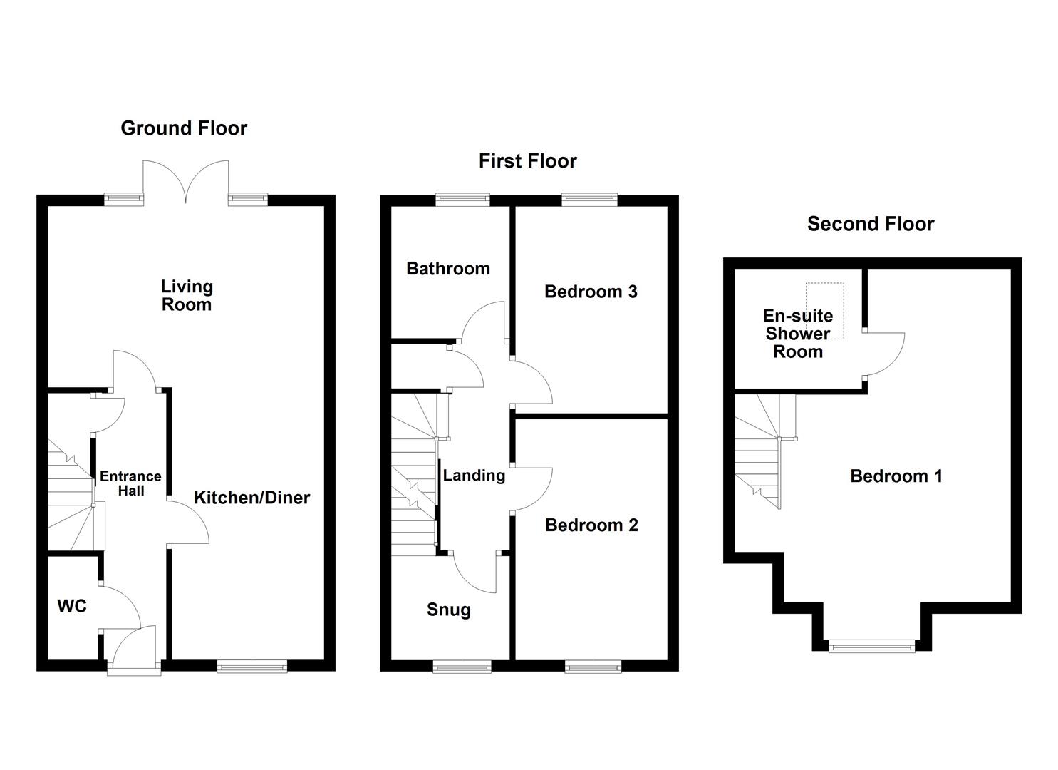The stylish kitchen comes complete with integrated appliances, flowing seamlessly into a bright living and dining area with plenty of natural light. Upstairs, you'll find generously sized bedrooms, each featuring fitted wardrobes, while the top floor principal suite provides a cosy retreat with views across open fields and an en-suite shower room.