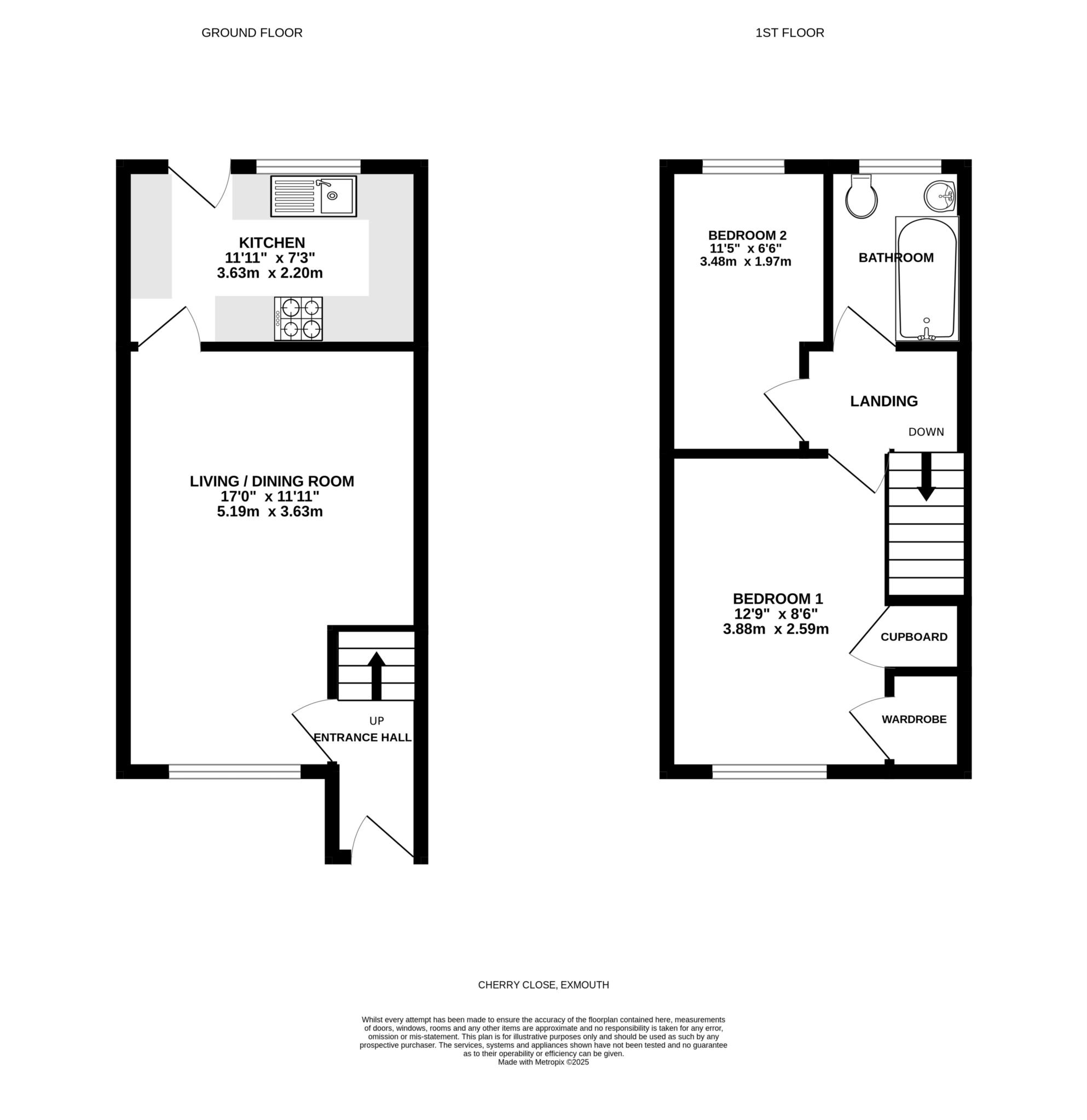 The ground floor features a spacious living/dining room and a modern, well equipped kitchen. Upstairs, there are 2 bedrooms along with a contemporary bathroom fitted with a shower over the bath.