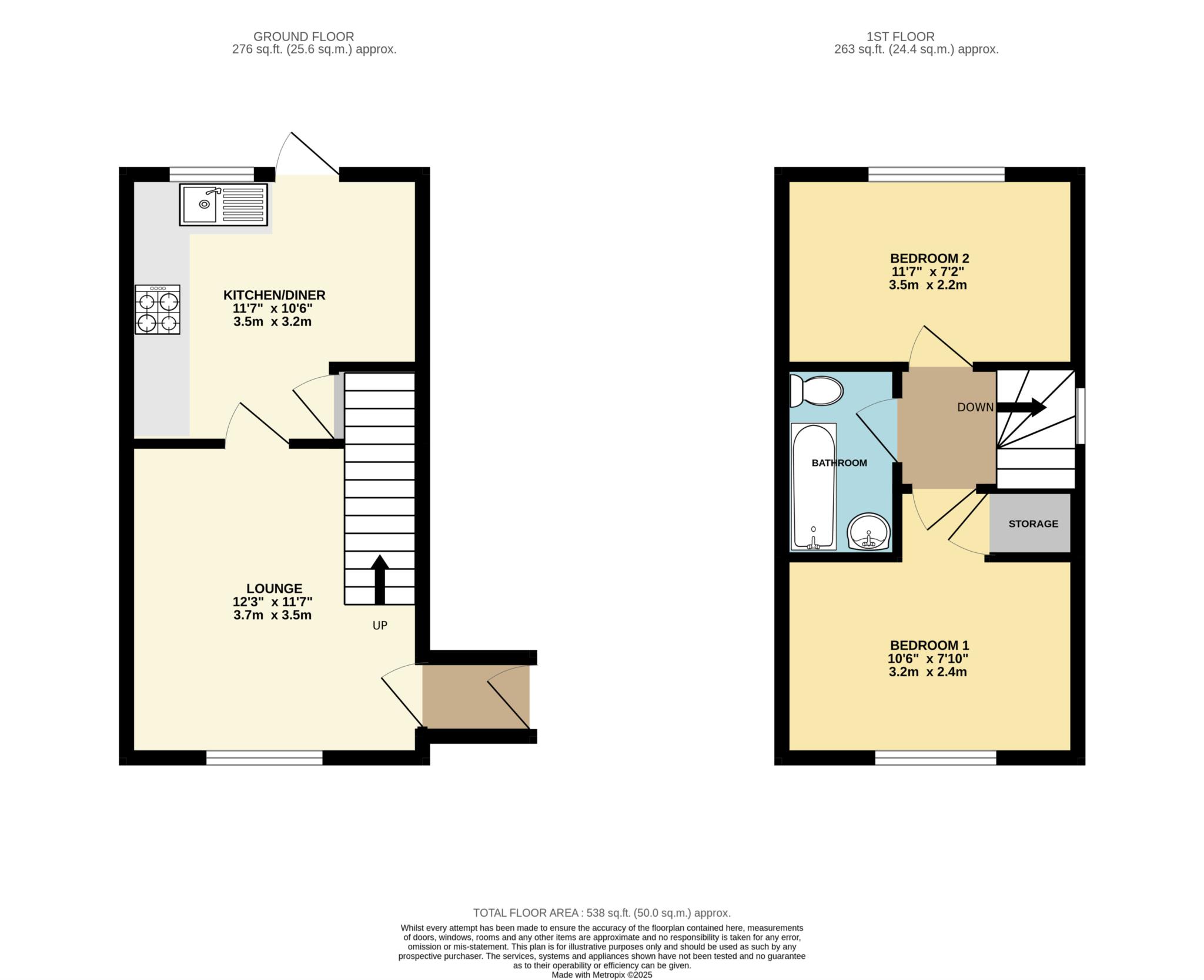 The property features an entrance porch, a lounge, and a kitchen-diner with large storage cupboard on the ground floor. Upstairs, there are two double bedrooms and a family bathroom. Externally, the home boasts a private, enclosed rear garden and benefits from off-road parking at the front.