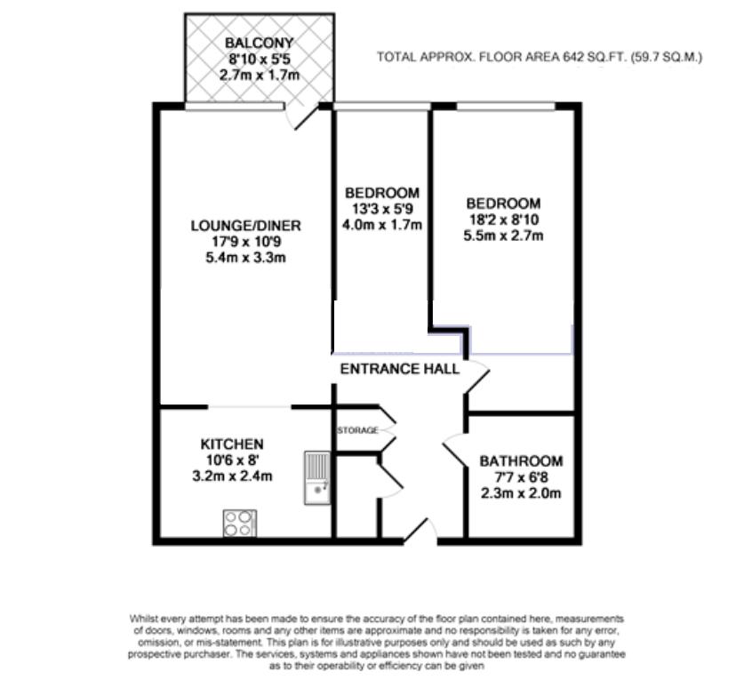ENTRANCE HALL KITCHEN 10' 6" x 8' (3.2m x 2.44m) LOUNGE/DINER 17' 9" x 10' 9" (5.41m x 3.28m) BEDROOM 1 13' 3" x 5' 9" (4.04m x 1.75m) BEDROOM 2 18' 2" x 8' 10" (5.54m x 2.69m) BATHROOM 7' 7" x 6' 8" (2.31m x 2.03m) BALCONY 8' 10" x 5' 5" (2.69m x 1.65m)