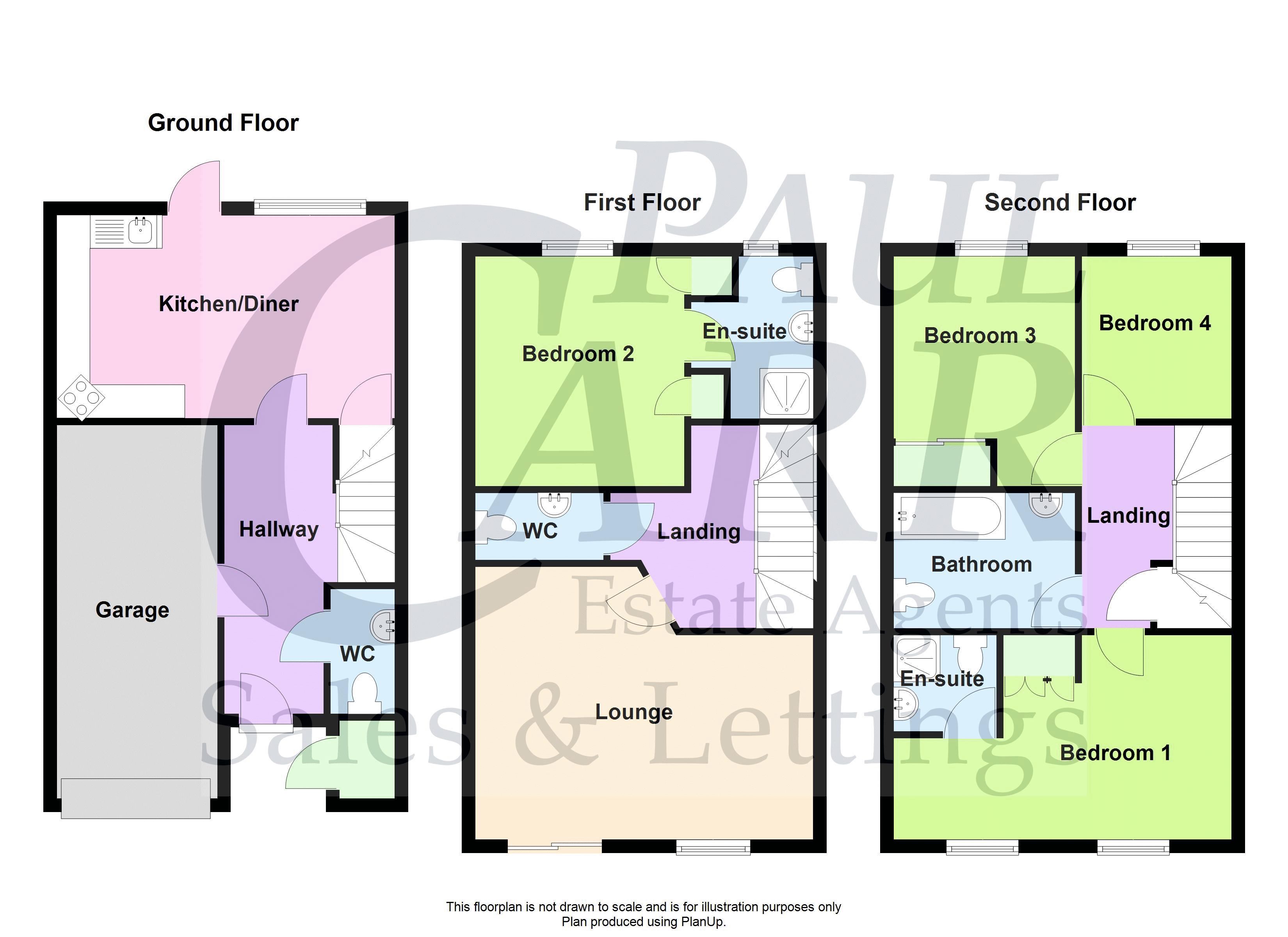 The second floor landing provides loft hatch access, an over-stairs storage cupboard housing the water tank and a ceiling light point, with doors leading to the remaining accommodation. Bedroom one benefits from two double glazed windows to the front, two radiators, ceiling light point and fitted wardrobes, along with an en-suite shower room featuring a shower cubicle, low flush WC, wash hand basin, radiator and ceiling light point. Bedroom three offers a double glazed window to the rear, fitted wardrobes, radiator and ceiling light point, while bedroom four also enjoys a rear-facing double glazed window, radiator and ceiling light point. The family bathroom is fitted with a bath with shower over, low flush WC, wash hand basin, radiator and ceiling light point.