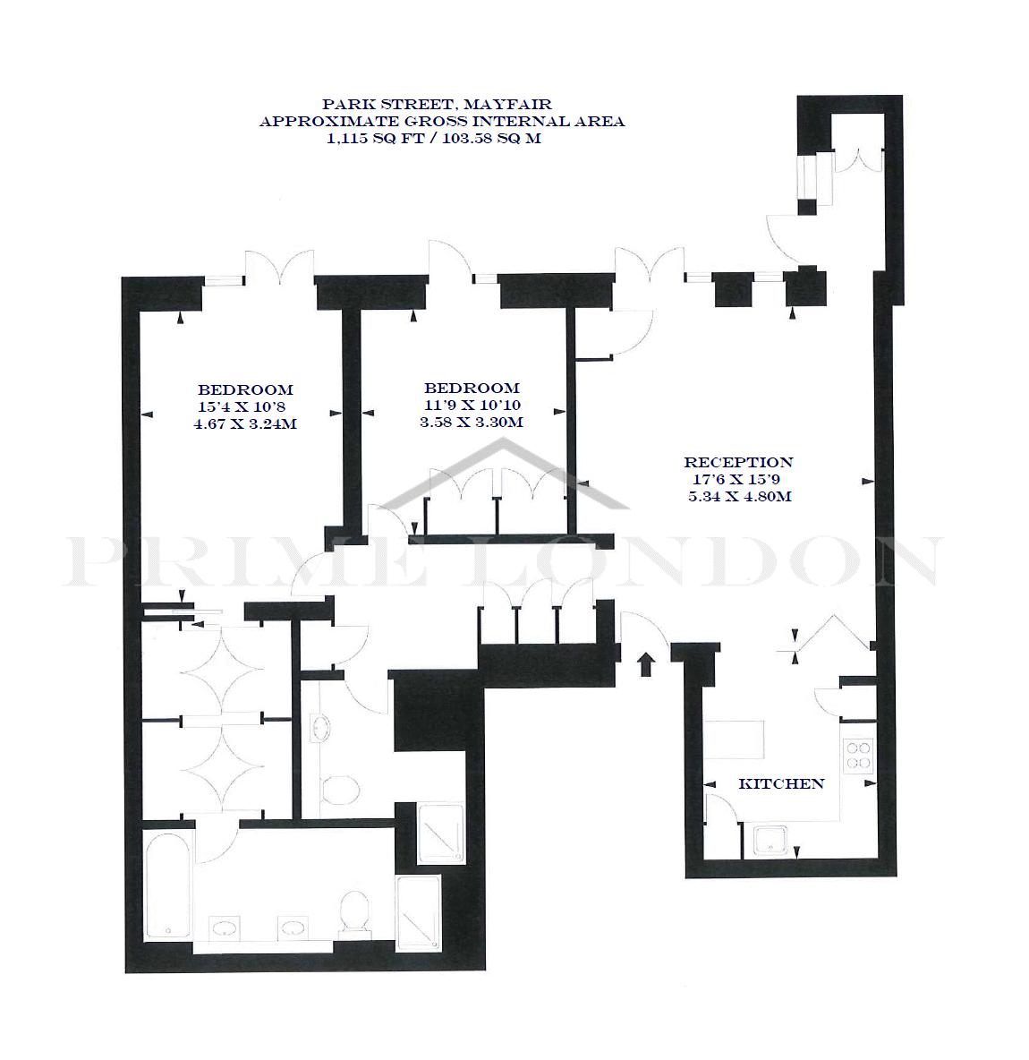 Located close to Hyde Park and sitting just off the famous Park Lane, this 1,115 sq ft / 103.58 sq m apartment benefits from a light and spacious reception room and separate modern kitchen, two double bedrooms, one of which features a hidden en-suite bathroom entered via discreet wardrobe doors, and a separate shower room.