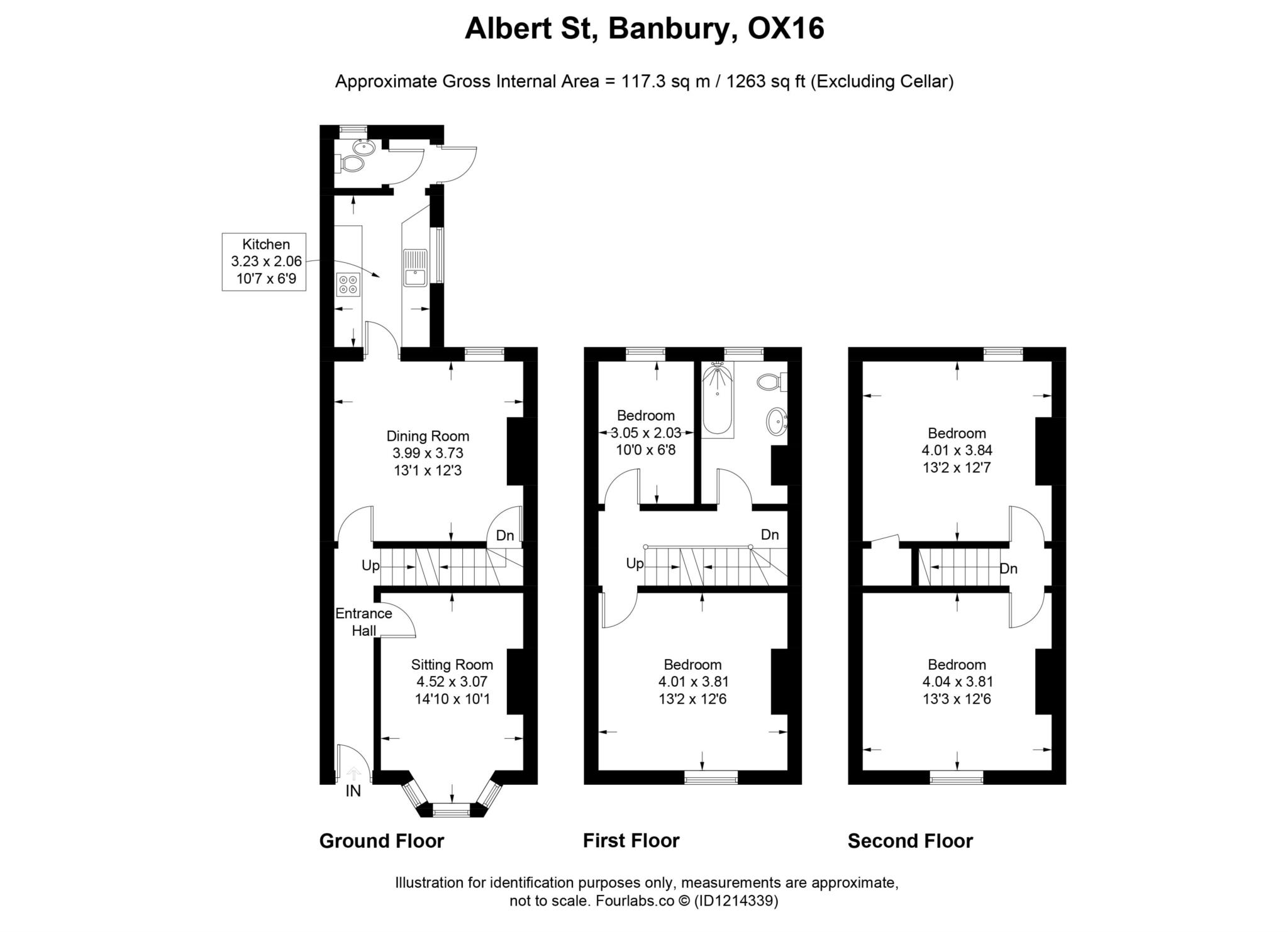 From the hallway leads the two reception rooms with large bay window to the front in the Sitting Room. From the Dining Room leads the Kitchen with light wood coloured fully fitted units, with granite effect worktops. There is an integrated electric oven, with electric hob over and fan. With space for a washing machine; and a freestanding fridge freezer (with non-repair clause). From the Kitchen is the inner lobby with door to cloakroom, also from the lobby is the courtyard garden. The garden is low maintenance and enclosed with patio and beds. On the first floor and second floor there are 4 double bedrooms and the good-sized family bathroom with shower over bath.