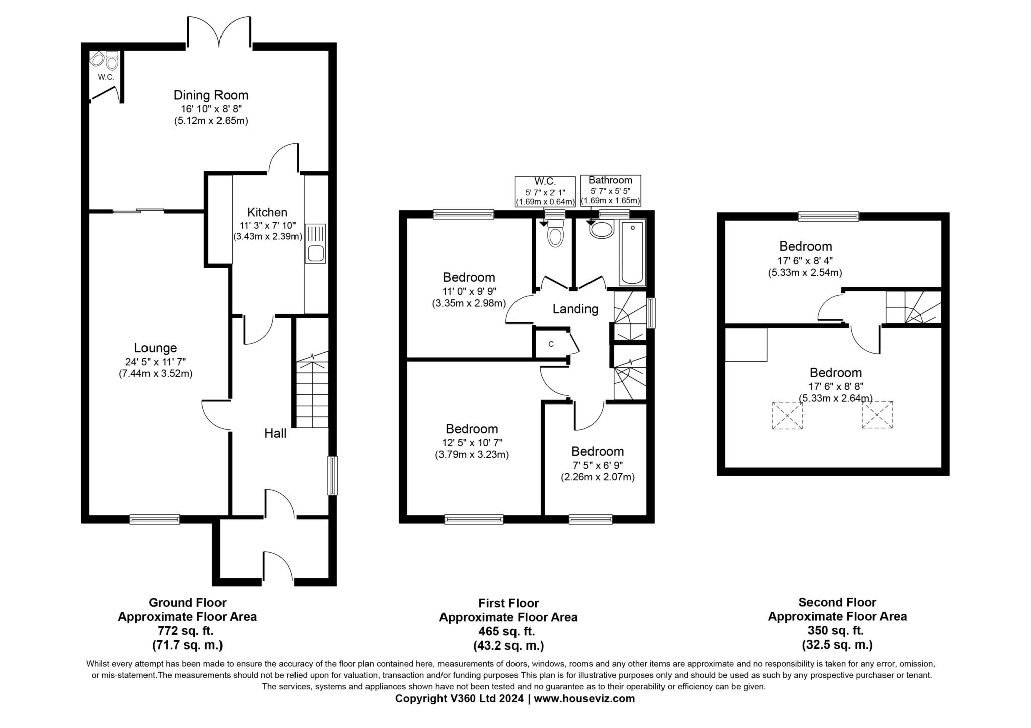 The property features a through lounge and a galley style kitchen on the ground floor, along with an extended rear section comprising a dining area and a WC. The first floor accommodates two double bedrooms, a single bedroom, and a bathroom with a separate WC. On the second floor, there is a generously sized double bedroom and another single bedroom/study.