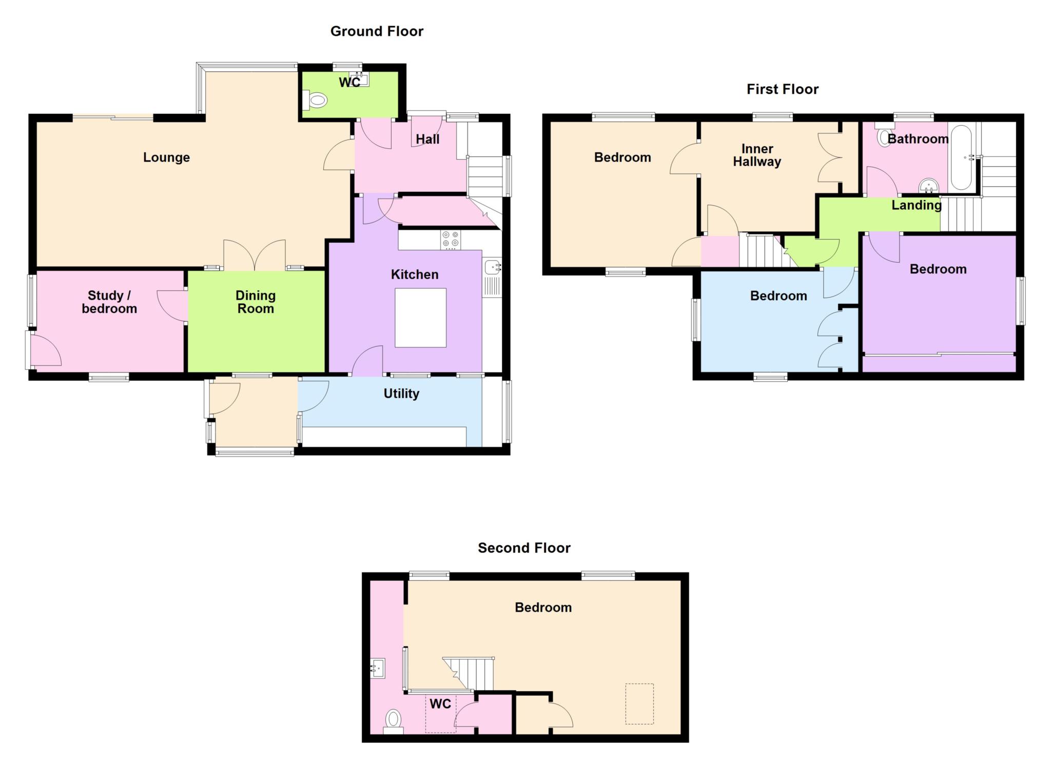 4 Bed detached house with 3 reception rooms, kitchen and utility. The property has a cloakroom, family bathroom on the 1st floor and WC area off the master bedroom. Outside is gardens to front, side and rear with parking and garage.