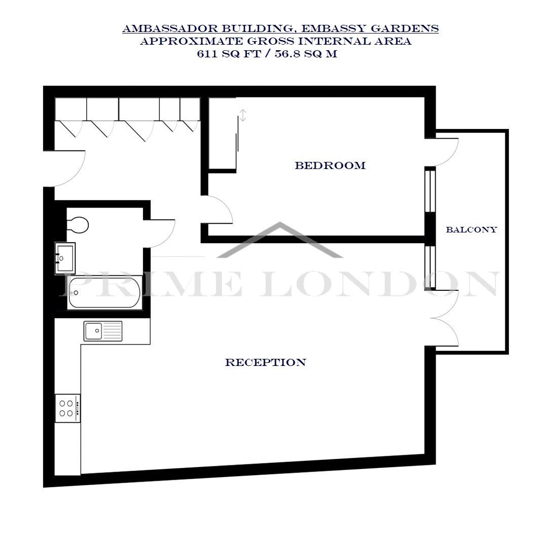 A spacious one bedroom apartment in the highly sought after Embassy Gardens, totalling 611 sq ft (56.8 sq m), available to rent exclusively through Prime London.