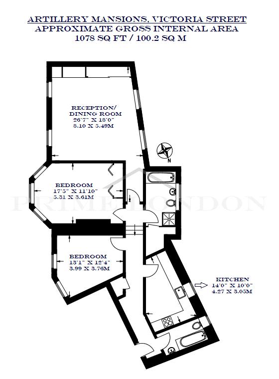 This beautiful and larger than average two-bedroom apartment, of 1,078 sq ft (100.2 sqm), located in the prestigious Artillery Mansions development, is available to rent through Prime London.
