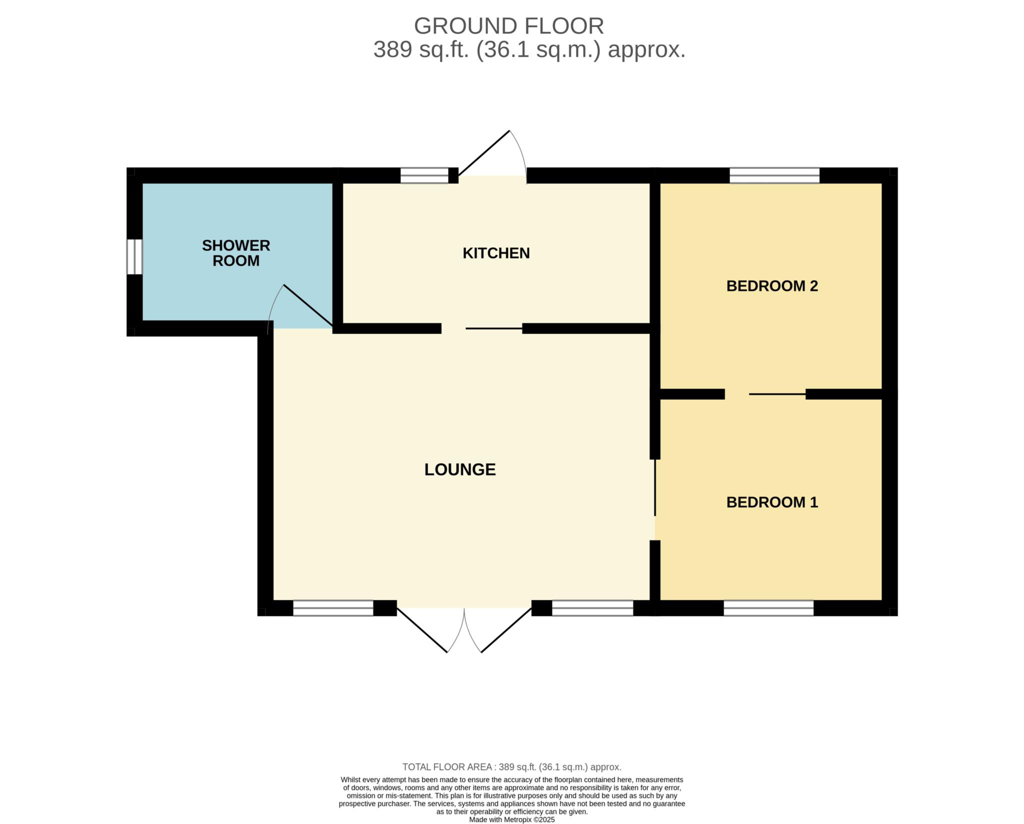 Inside, the home features a central lounge with plenty of natural light, a compact kitchen, a shower room, and two bedrooms. The living space opens directly onto the front garden, while the kitchen gives access to the rear. Both bedrooms are well-proportioned for a park home of this size, making it practical for either couples or small families.