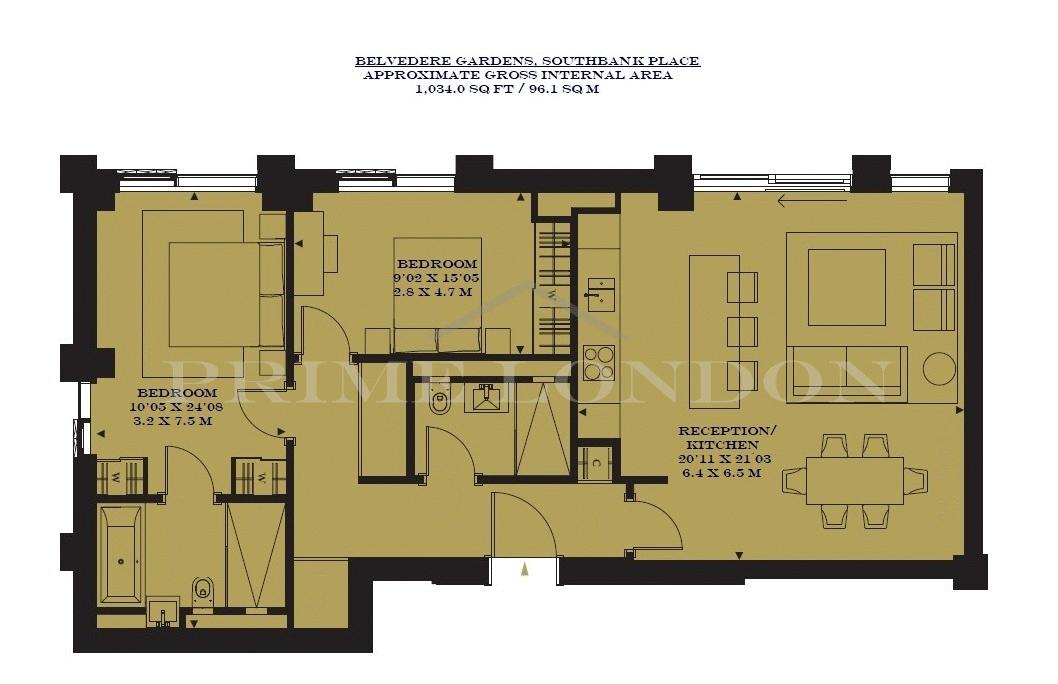 The apartment offers 1,034 sq ft / 96.1 sq m of internal space, and benefits from having a spacious open plan reception with fully integrated kitchen with marble worktops, two double bedrooms each with fitted wardrobes, and two bathrooms with fitted marble surfaces (one of which is en-suite). The property also benefits from having comfort cooling and underfloor heating.