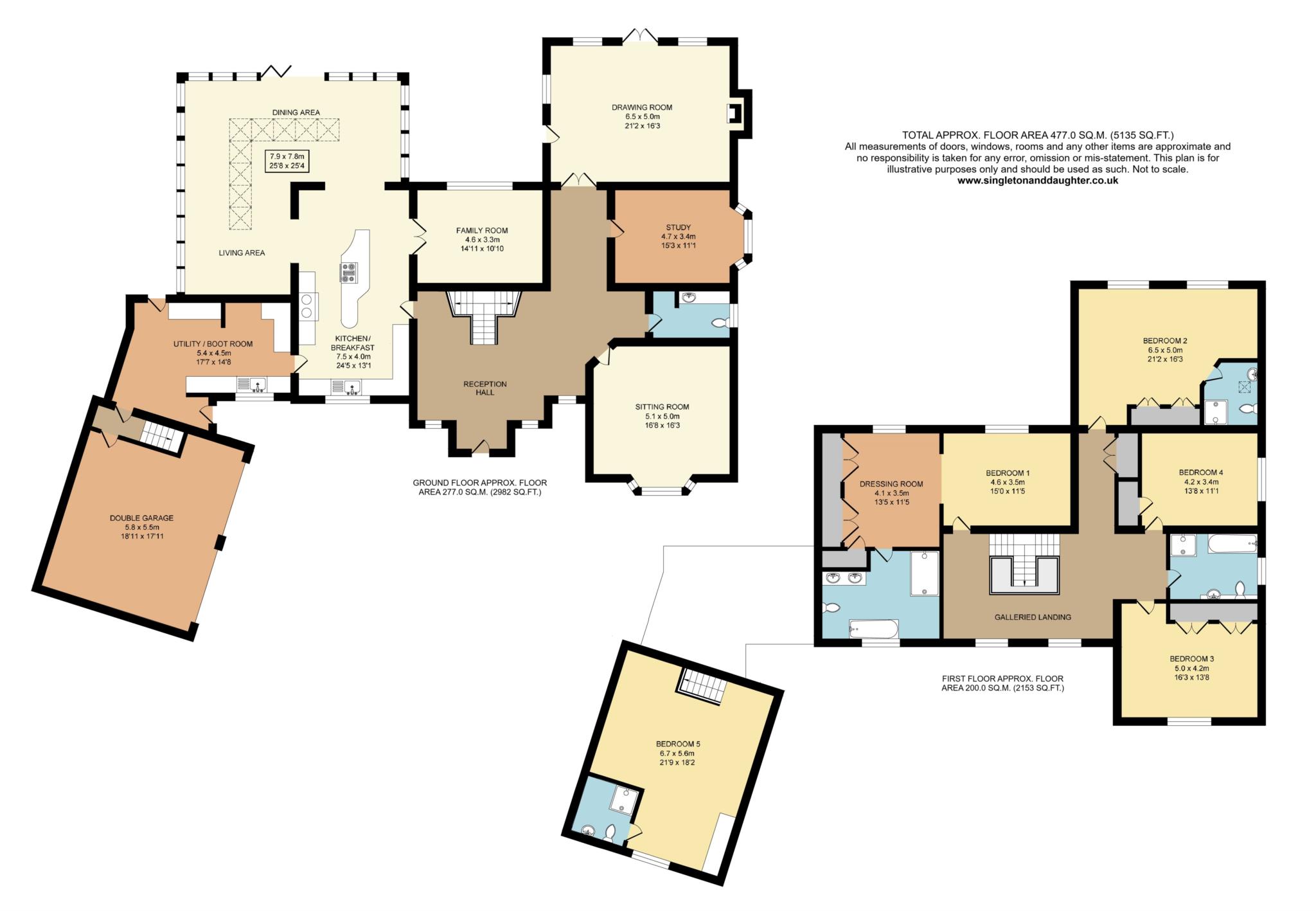 Accommodation: Sitting room, study, drawing room, family room, kitchen/breakfast room, Orangerie with living and dining area, utility/boot room, cloakroom, 5 double bedrooms, 3 ensuite shower rooms, family bathroom, dressing room to bedroom 1.