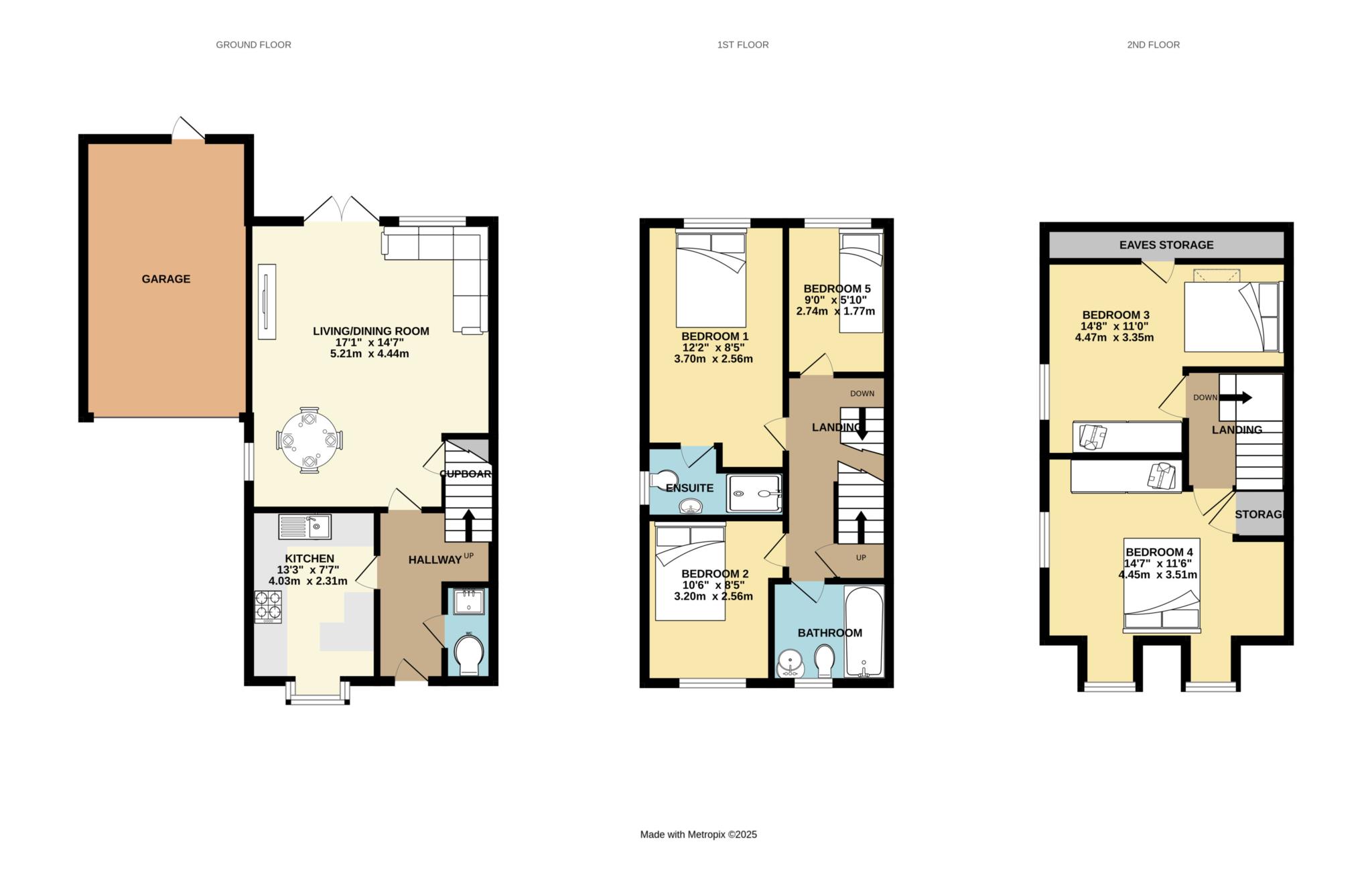 The first floor has the master bedroom with En-Suite shower room, a further double bedroom, single bedroom and family bathroom, and stairs up to the second floor, which has two more double bedrooms.