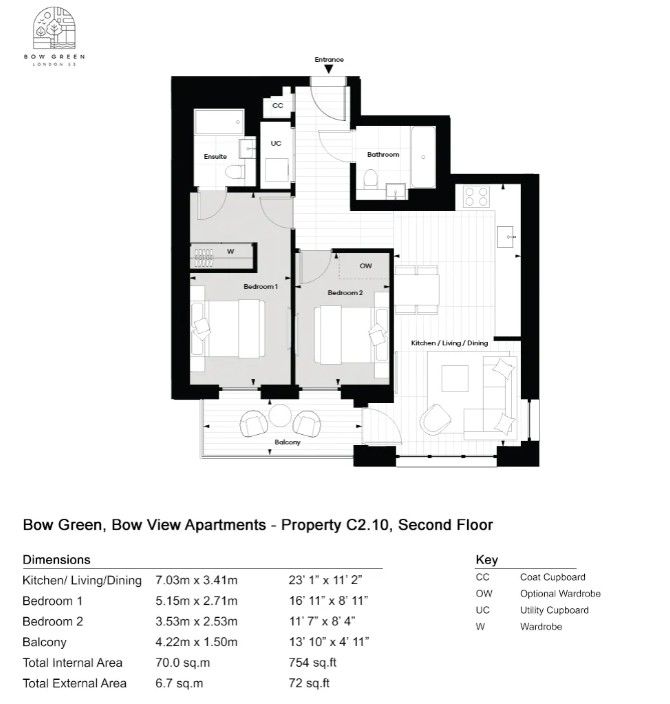 This stylish 2-bedroom apartment on the 2nd floor of Bow Green offers a well-balanced layout ideal for modern living.