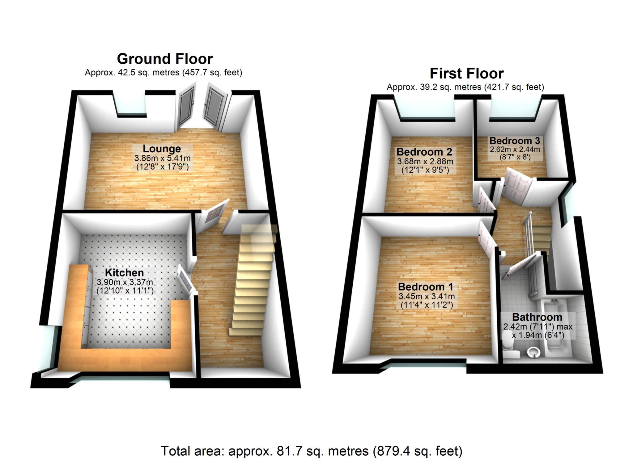 Bathroom - three piece suite comprising of panel bath with over bath shower, hand wash basin, WC, tiled elevations, radiator and double glazed window to front.