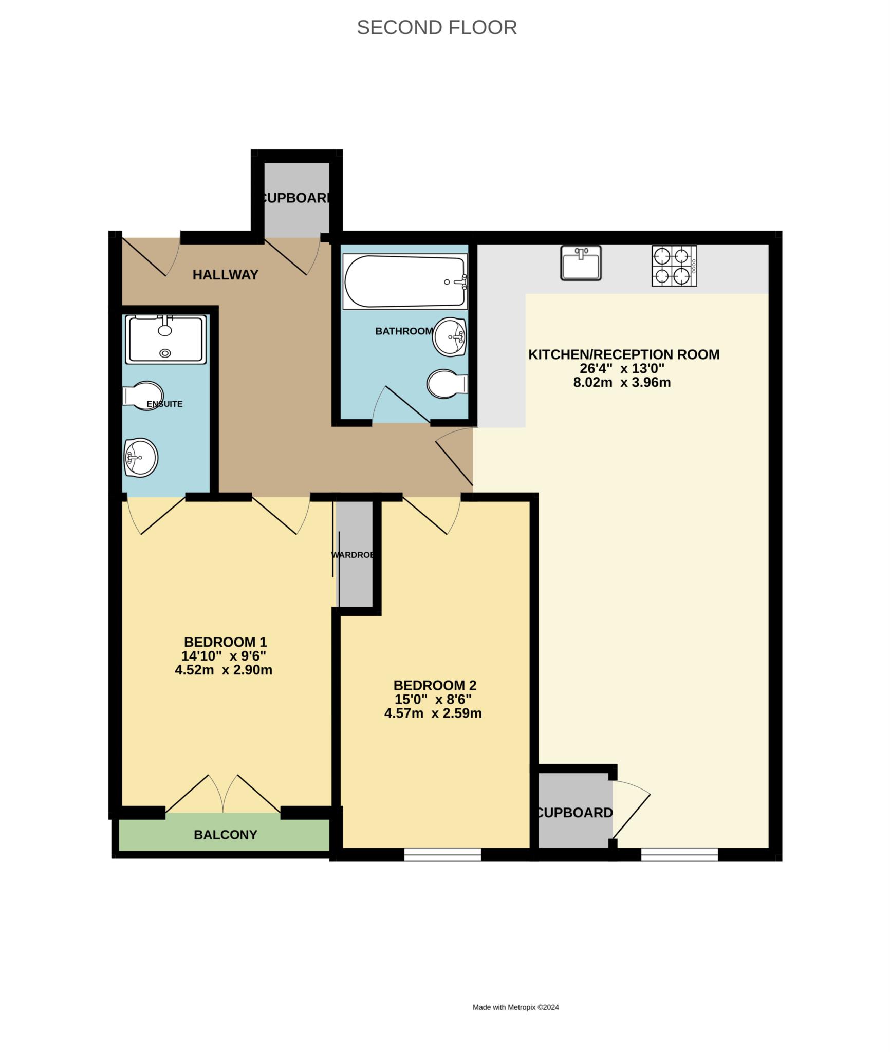 The flat features two bedrooms. The master bedroom comes complete with an en-suite and built-in wardrobes, providing ample storage space. The second bedroom is a generously sized double room, offering plenty of room for rest.