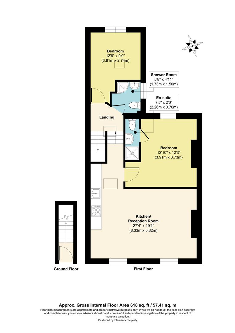 Next is your first bedroom, offering 155 square feet of well appointed space with soft neutral tones, white walls, and plush, taupe carpeting. Also featuring a large window for natural light and an open brick hearth, plus an en suite with a separate shower. The second bedroom, at the rear, overlooks the garden and has a similar design. An additional bathroom nearby includes white finishes, earth toned tiles, and a separate shower cubicle.