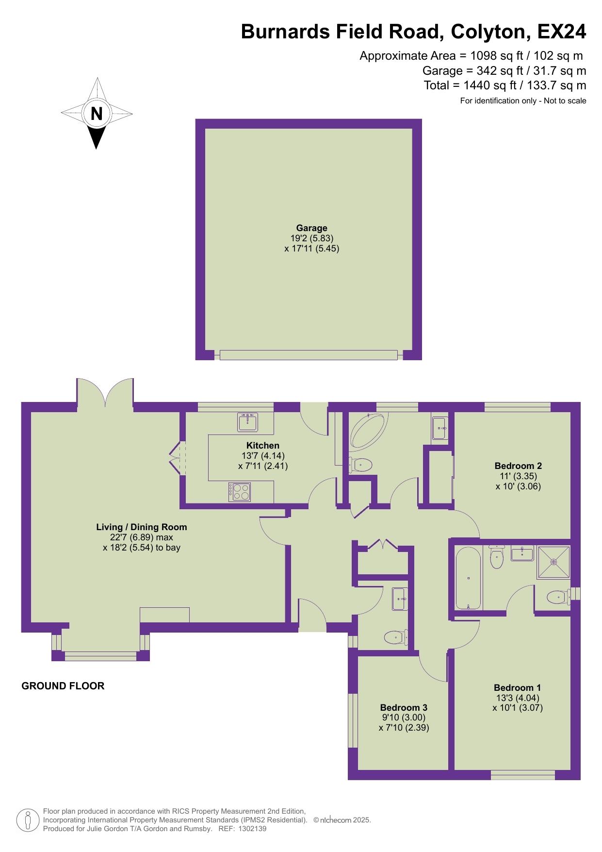 A spacious detached bungalow situated in a residential road approximately half a mile walk from the centre of Colyton. Built in the late 1980`s, the property provides well proportioned rooms, a number of them enjoy some lovely views over Colyton to distant hills. The accommodation comprises: hall, cloakroom, L-shaped living / dining room, master bedroom with en-suite, two further bedrooms, bathroom, and kitchen. There is a double garage beneath the property with driveway parking for two vehicles. Outside, there are well stocked gardens (albeit currently overgrown) to both the front and rear of the property. The property for most would benefit from some improvement, but benefits from gas central heating and double glazing.