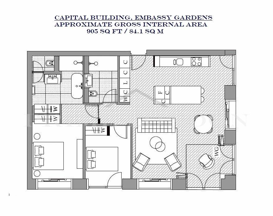 The apartment offers an excellent living space at 905 sq ft / 84.1 sqm, and comprises an open plan kitchen and living area, well-proportioned two double bedroom with ample built in storage, two luxury bathrooms (1 en-suite) and floor to ceiling windows.