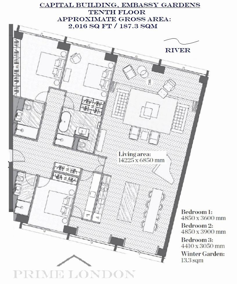 An apartment offering a very rare lateral space of over 2,000 sq ft, with full river views and secure parking, available chain free in The Capital Building, Embassy Gardens.