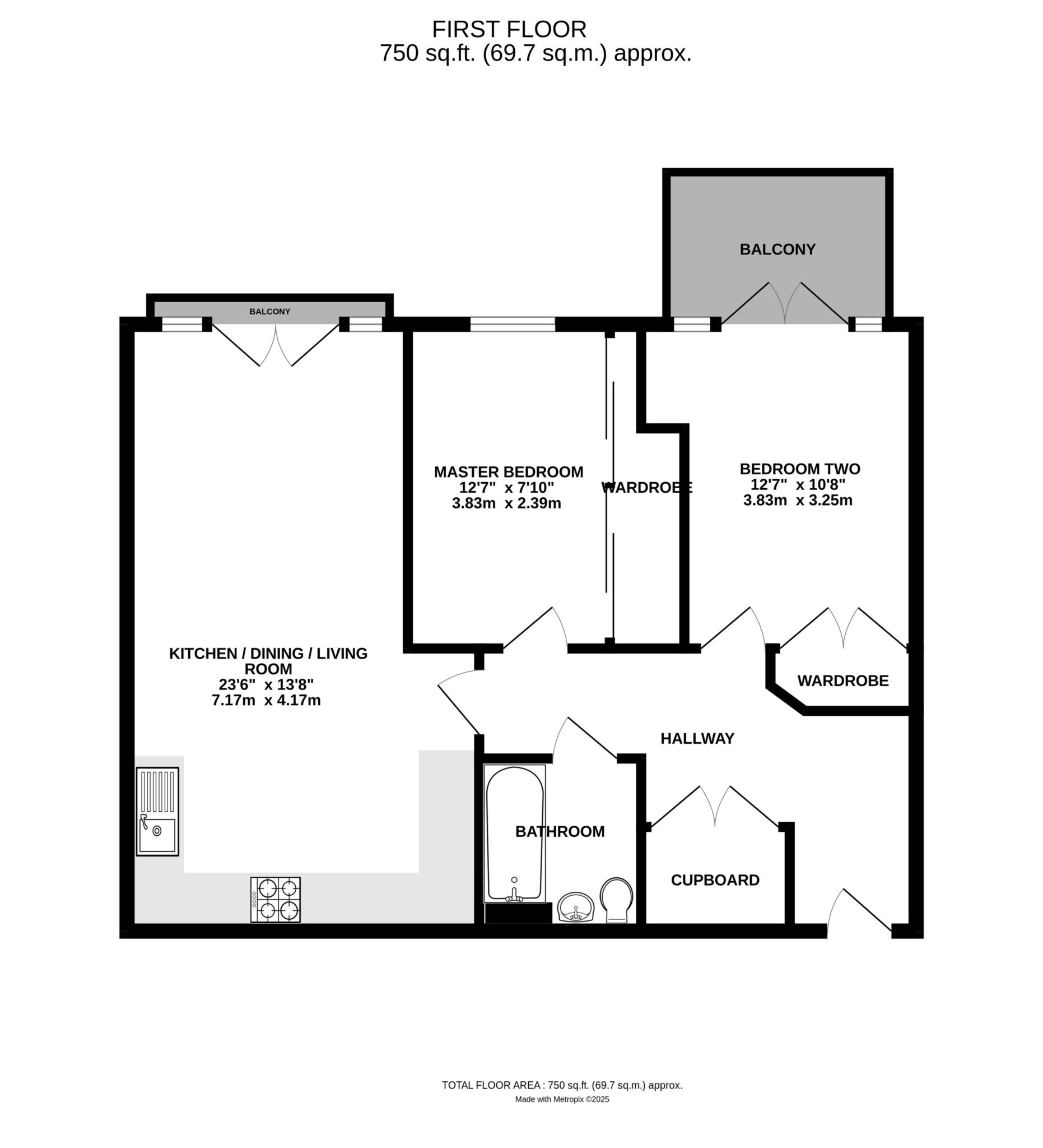The move in ready home includes an open plan kitchen/reception room with integrated appliances and access to a balcony, two double bedrooms with fitted wardrobes in the master, modern family bathroom, and a large storage/utility cupboard.
