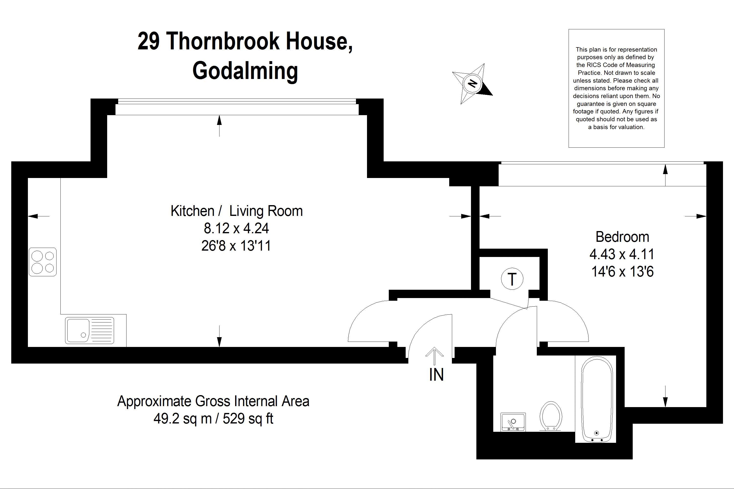 This well presented Penthouse Apartment has a spacious living room/kitchen with large triangular shaped window providing natural light and elevated outlook. The modern kitchen has a number of white gloss base level and eye level units, work surfaces and includes a range of appliances. The double bedroom also benefits from a large window with an elevated outlook. Externally the property benefits from a communal garden on the banks of the River Wey with seating areas and lawn. The property also benefits from a parking space.