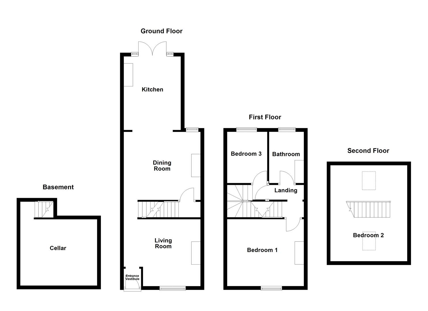 The accommodation briefly comprises an entrance vestibule leading into the living room, which in turn provides access to a further hallway with stairs to the first floor and entry to the dining room. The dining room offers access to the cellar and flows through to the kitchen, which opens onto the rear garden. To the first floor, the landing provides access to two bedrooms and the house bathroom, with stairs leading to the second floor, where a further double bedroom and useful storage can be found. Externally, the front garden is laid with artificial lawn and bordered by mature shrubs, with a timber gate and pathway leading to the entrance door. The rear garden is designed for low maintenance with a pebbled patio area, ideal for outdoor dining and entertaining, and is fully enclosed with gated access to the rear.