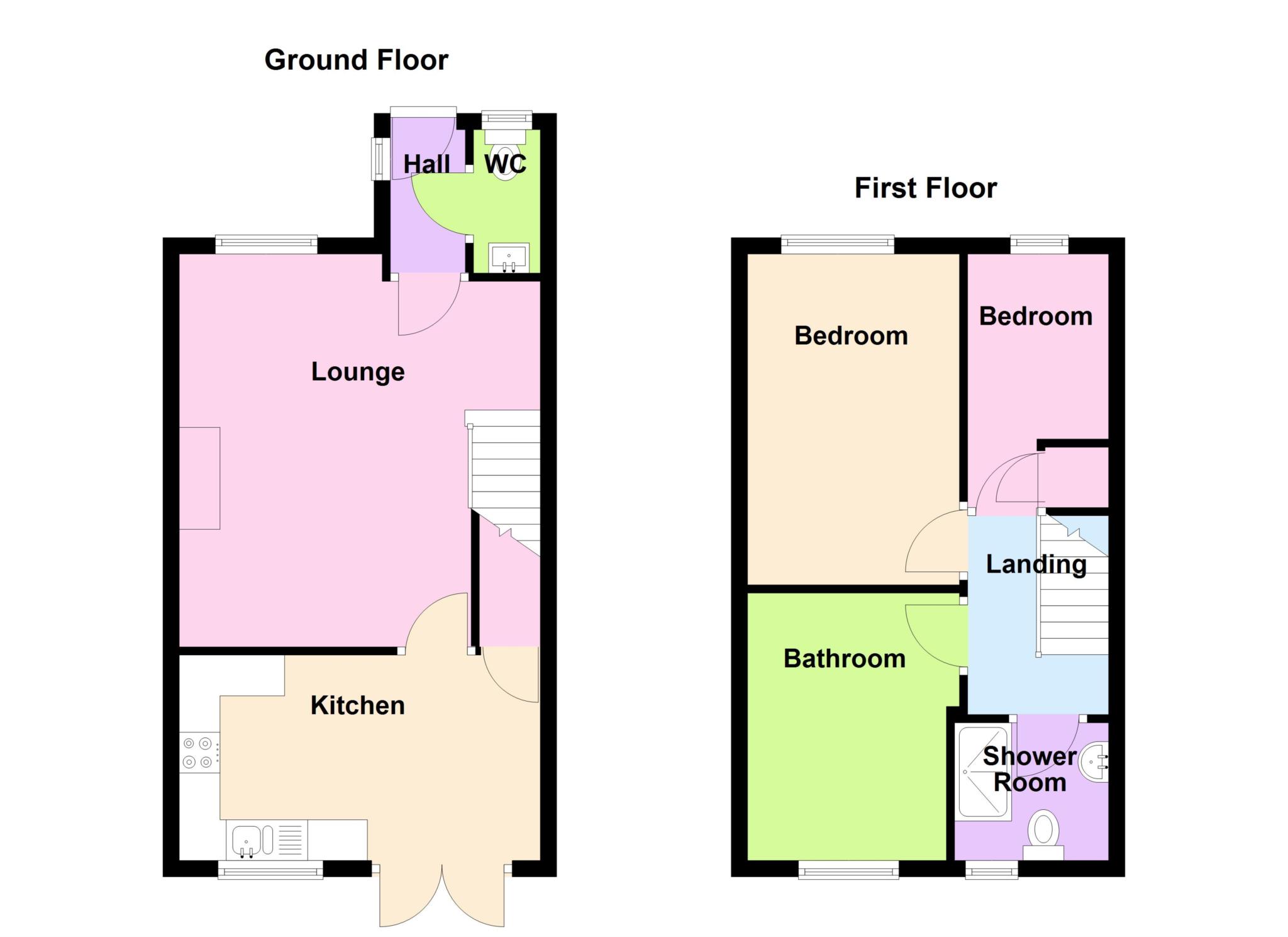 Shower cubicle with Mira shower, low level W.C., vanity hand basin with cupboard under, tiled walls, PVCu double glazed window, extractor fan.