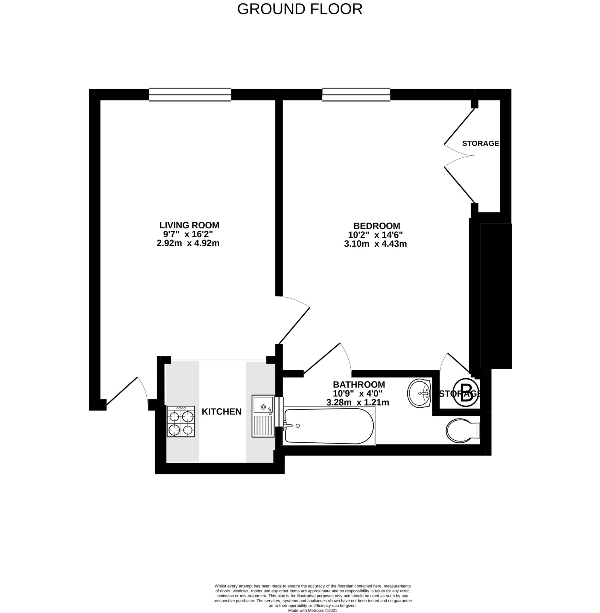 Living room with open plan kitchen with oven and hob and space for white goods. Large double bedroom with built in wardrobes and an en suite bathroom with a shower over the bath.