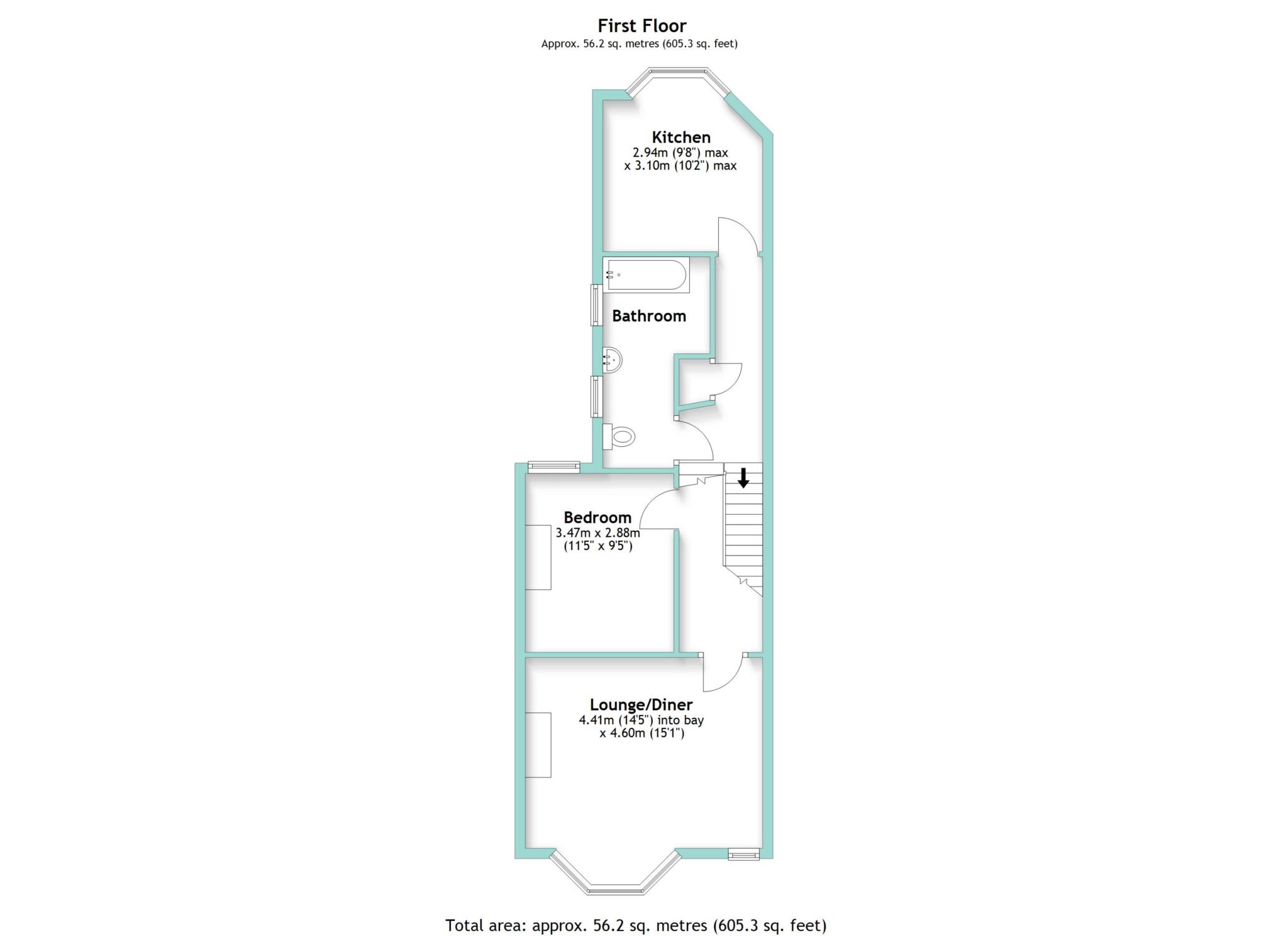 The accommodation comprises a spacious lounge/diner with bay window, a double bedroom, bathroom, and separate kitchen.