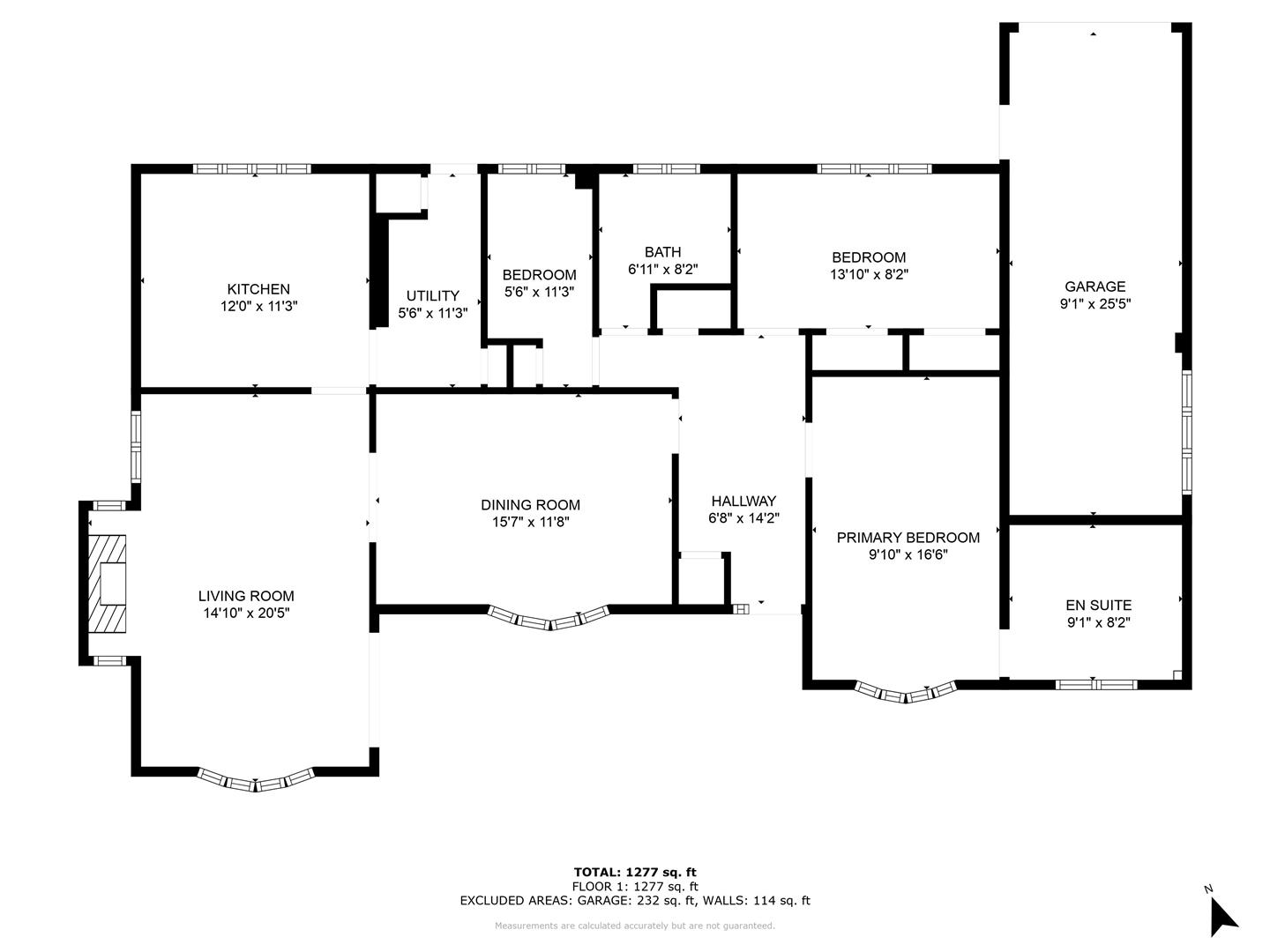 The internal layout includes a spacious entrance hallway that leads to a generous living room with a bay window and fireplace, alongside a separate dining room that also enjoys garden views. The kitchen is positioned to the rear of the property with access to a useful utility room. Three bedrooms are served by a family bathroom, with the primary bedroom benefitting from an en-suite.