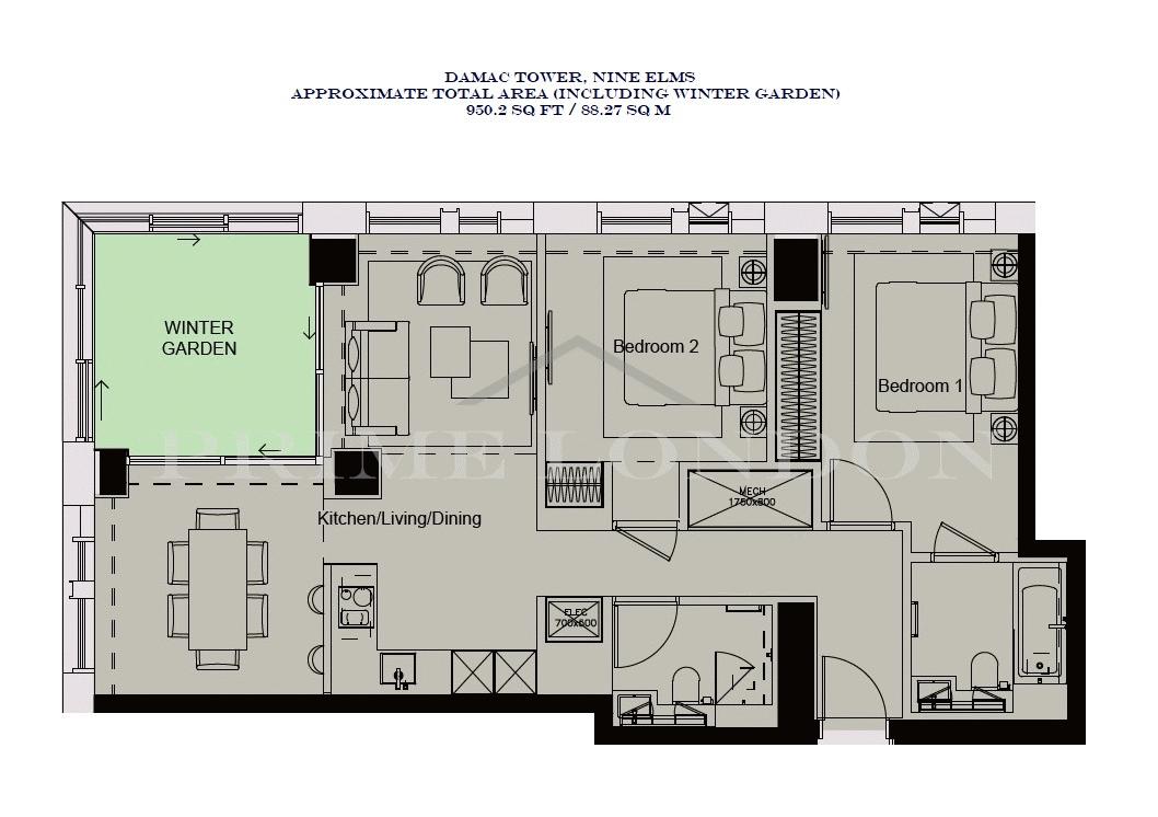 The 950 sq ft / 88.27 sq m (divided as an apartment area of 845.3 sq ft and a winter garden of 104.9 sq ft) property comprises of a spacious open plan reception with substantial winter garden and fully fitted kitchen and breakfast bar, two equal double bedrooms, and two modern and luxury bathrooms (one of which is en suite). The property also benefits from wooden flooring throughout and floor to ceiling windows.