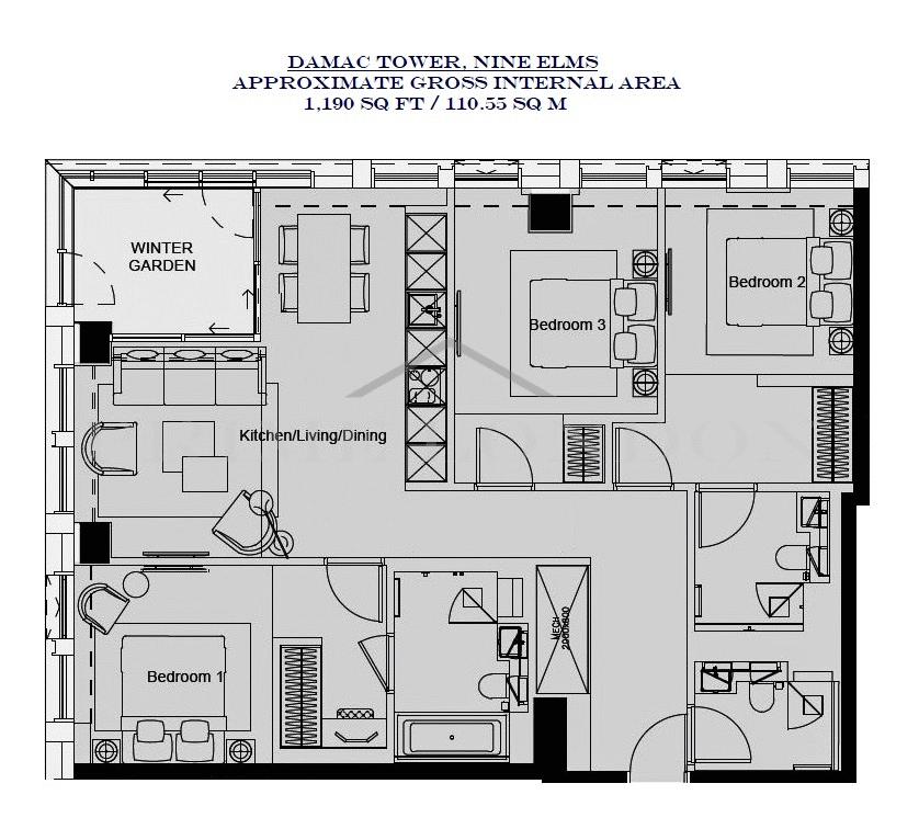 This brand new north facing three bedroom apartment, sent on a higher floor in Damac Tower with winter garden and striking views of the city of London (including the Thames, The Shard, London Eye, Big Ben and the Houses of Parliament), is available for chain free sale through Prime London.