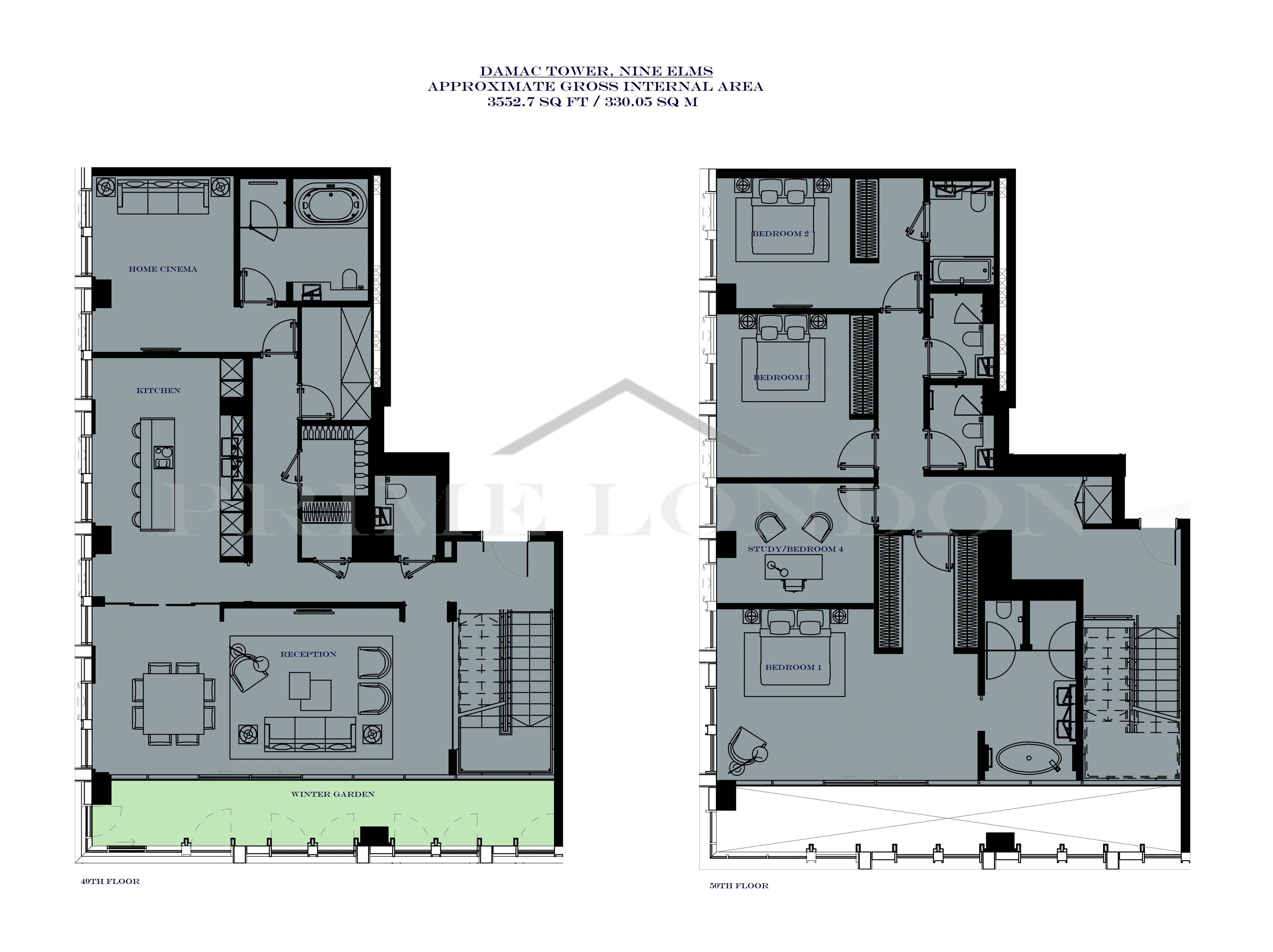The 49th floor comprises a substantial reception room, which stretches across the front of the apartment, opening out to a generous double height winter garden which enjoys sweeping views looking south west over Nine Elms to the River Thames. Set behind the reception you will find a sensational state of the art kitchen, complete with marble topped surfaces, breakfast island and fully integrated Miele appliances. The final room, nestled at the back of the apartment, is a well-positioned private home theatre room with ensuite bathroom featuring a jacuzzi style bath.