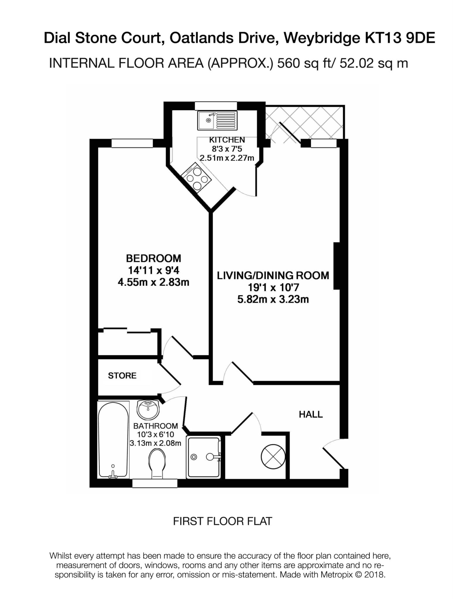 A 1 bedroom 1st floor apartment in the popular 60+ development of Dial Stone Court, Weybridge. Comprising a bright and spacious reception room which leads out onto a balcony, a kitchen with a window, principle bedroom with double wardrobe, bathroom with a bath and separate shower and large storage cupboard off the hallway. In excellent condition throughout.