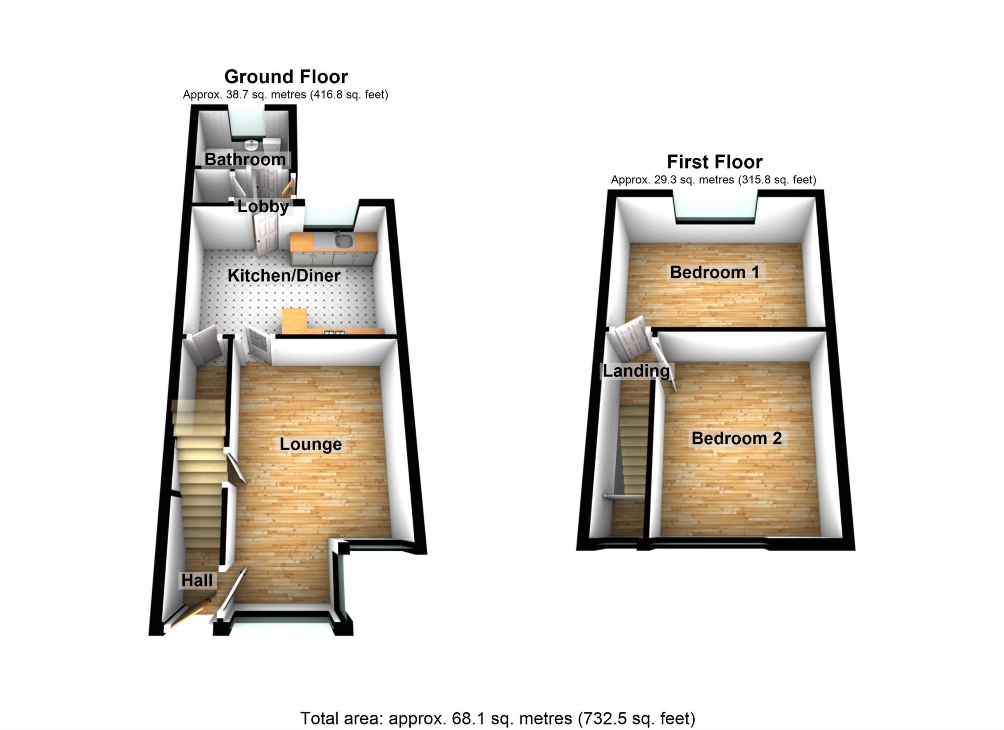 Step inside to find entrance hall leading onto a good sized lounge, fitted kitchen diner with integrated appliances, downstairs bathroom. Moving upstairs are two double bedrooms both with feature fireplaces. The is also a 50ft garden to the rear laid to lawn.