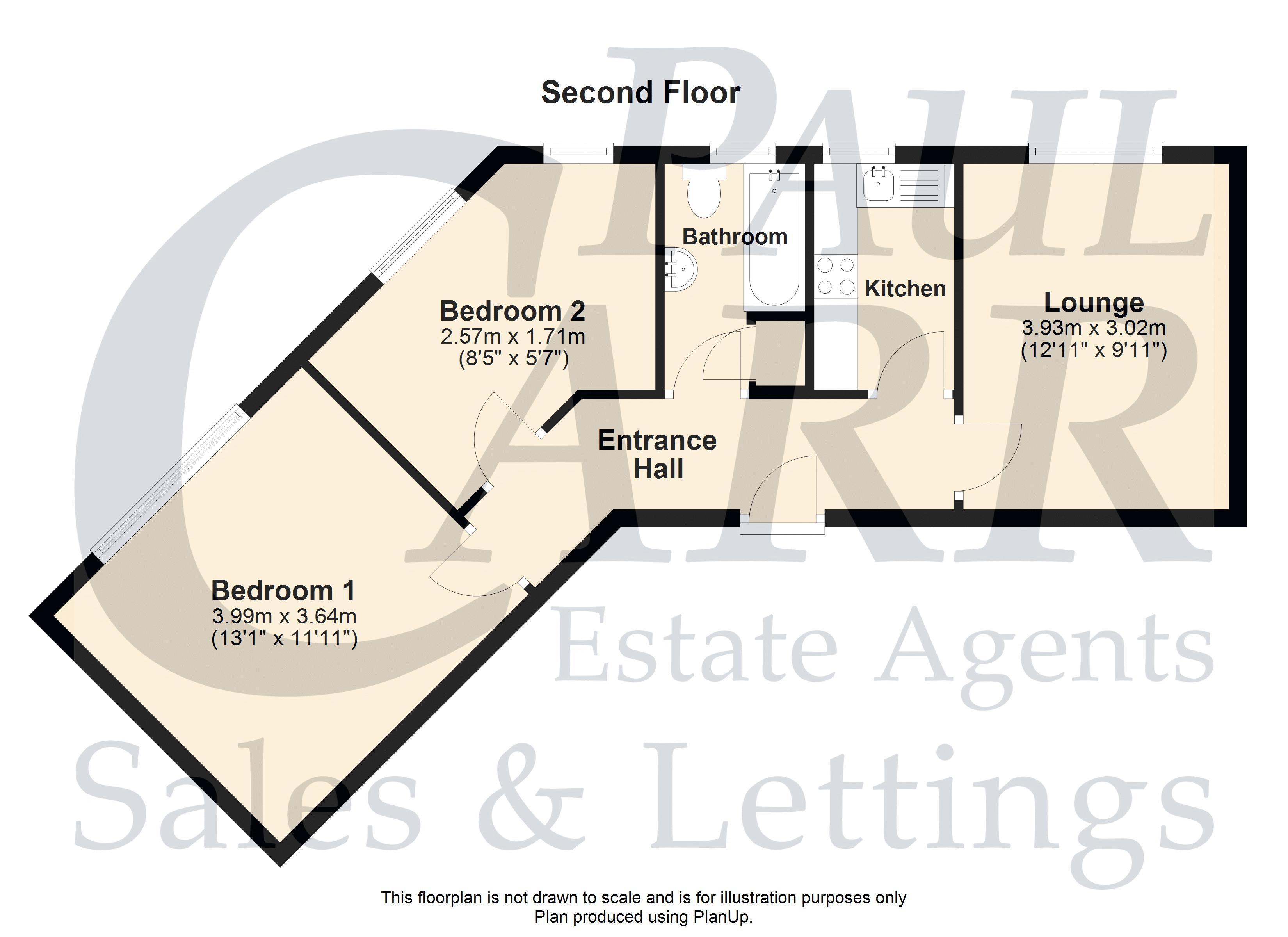 This spacious apartment is accessed via the communal entrance and stairs to the second floor. The apartment door opens to the entrance hallway with doors to: generous lounge diner with window to the front aspect; Modern fitted kitchen with a good array of storage cupboards, appliances and window to the front aspect.