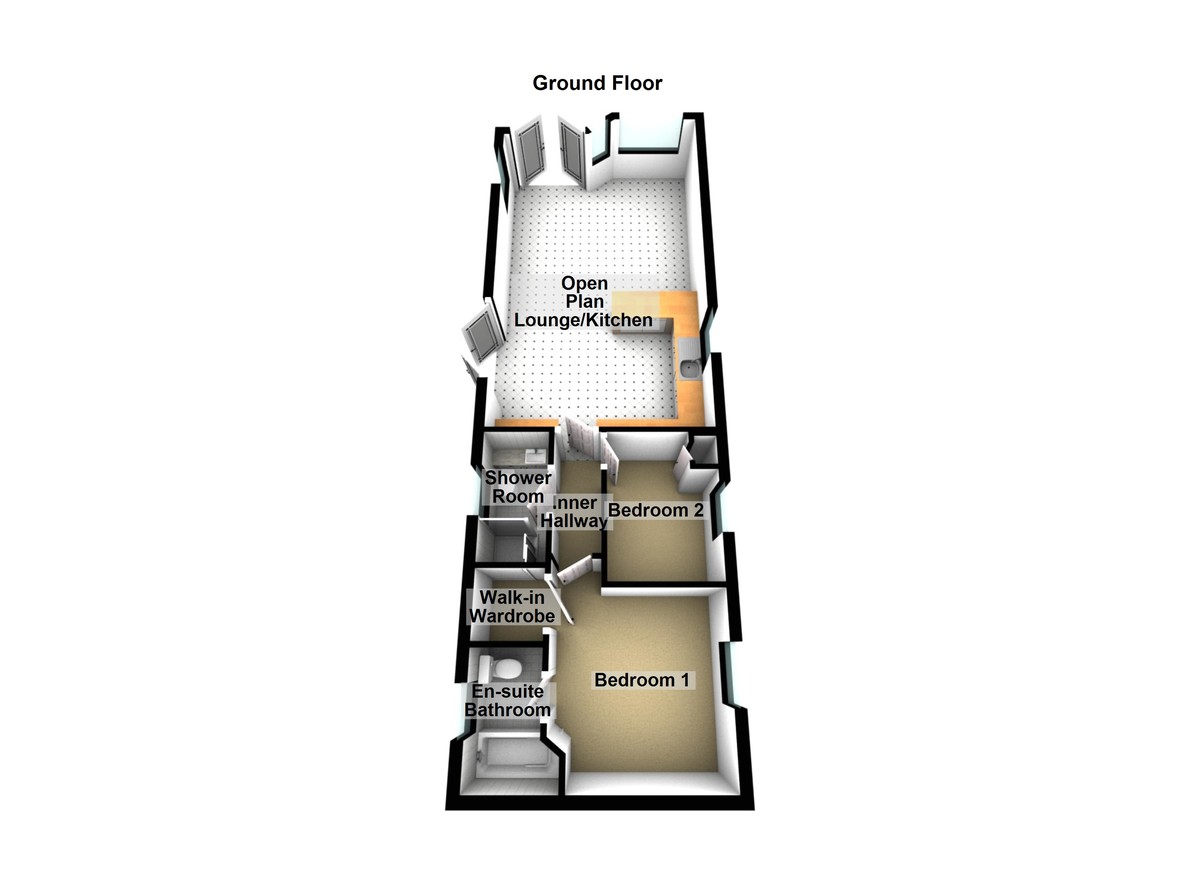 There are two bedrooms with the master bedroom boasting a large walk in wardrobe and a full en-suite bathroom. The second room is a good size single offers a fitted wardrobe cupboard as well as a range of overhead cupboards. This is supported by the shower room which presents with a white suite with walk in shower, low flush WC and pedestal wash hand basin.