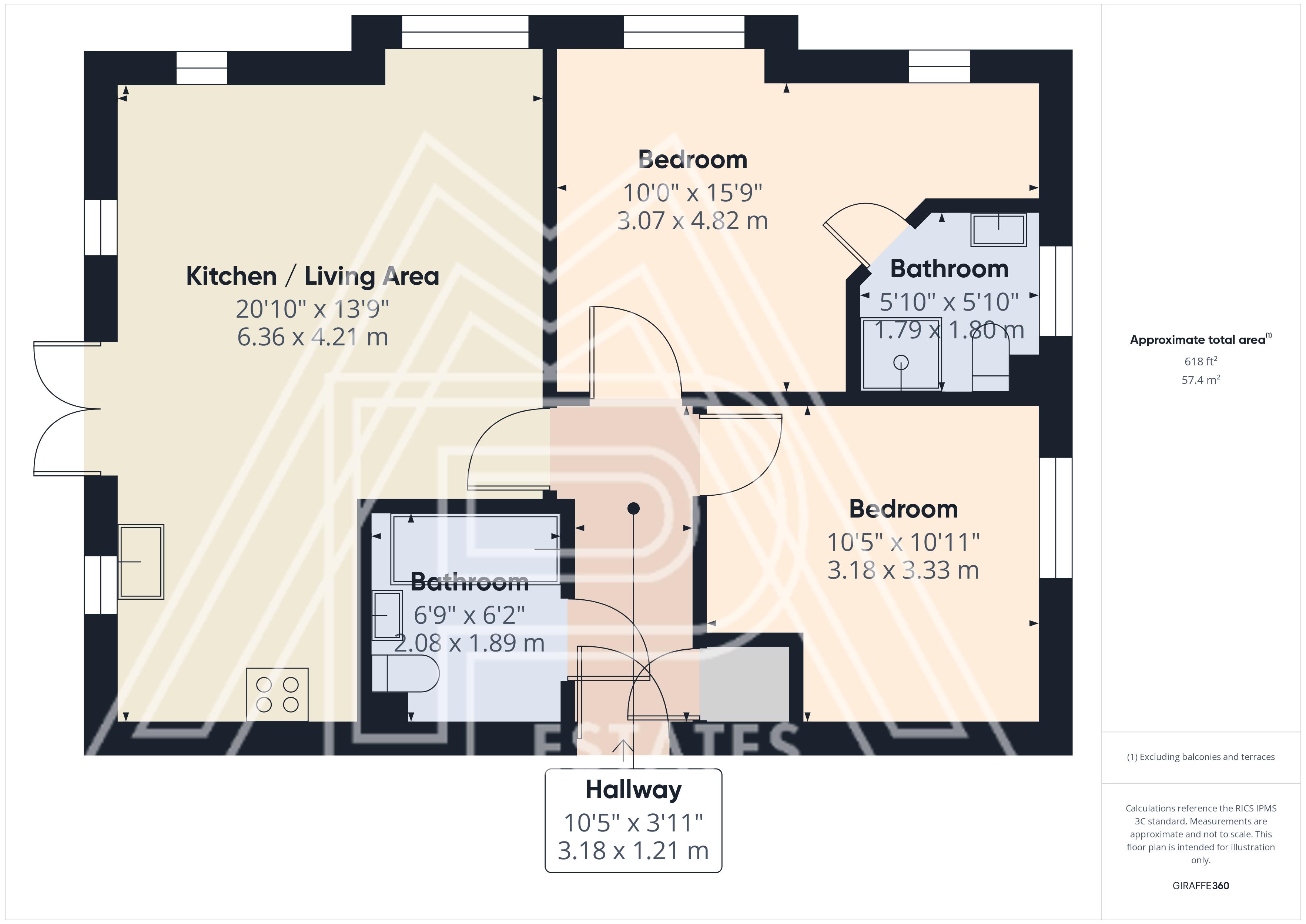 There are two generous bedrooms, with the main bedroom enjoying an en-suite shower room, while the second bedroom is ideal as a guest room, children’s room, or home office. A separate, modern bathroom completes the interior.