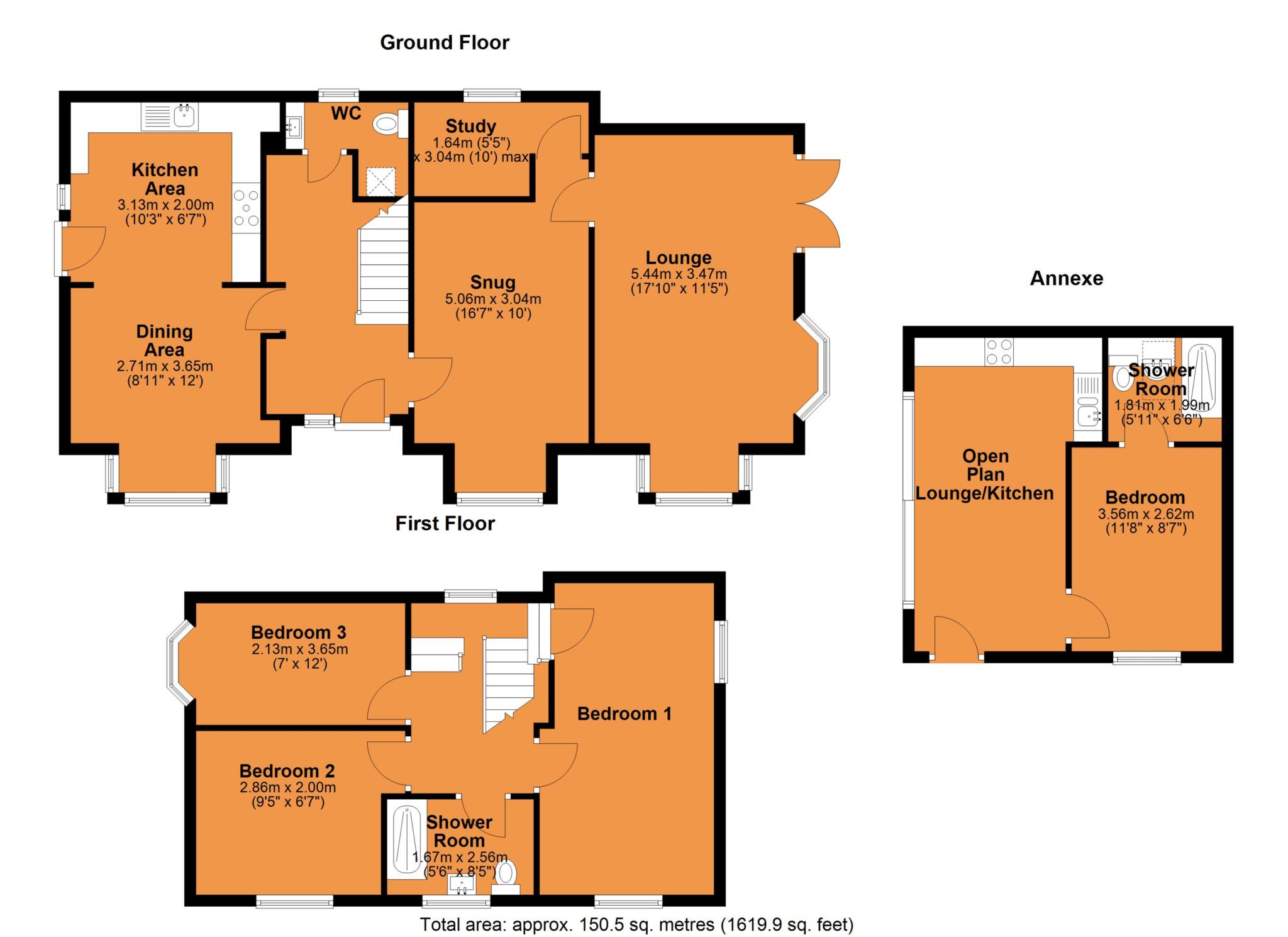 The main house comprises versatile accommodation to comprise entrance hall, ground floor cloakroom/W.C with plumbing and space for a washing machine, snug with box bay window, study and a spacious lounge with French doors and two bay windows.