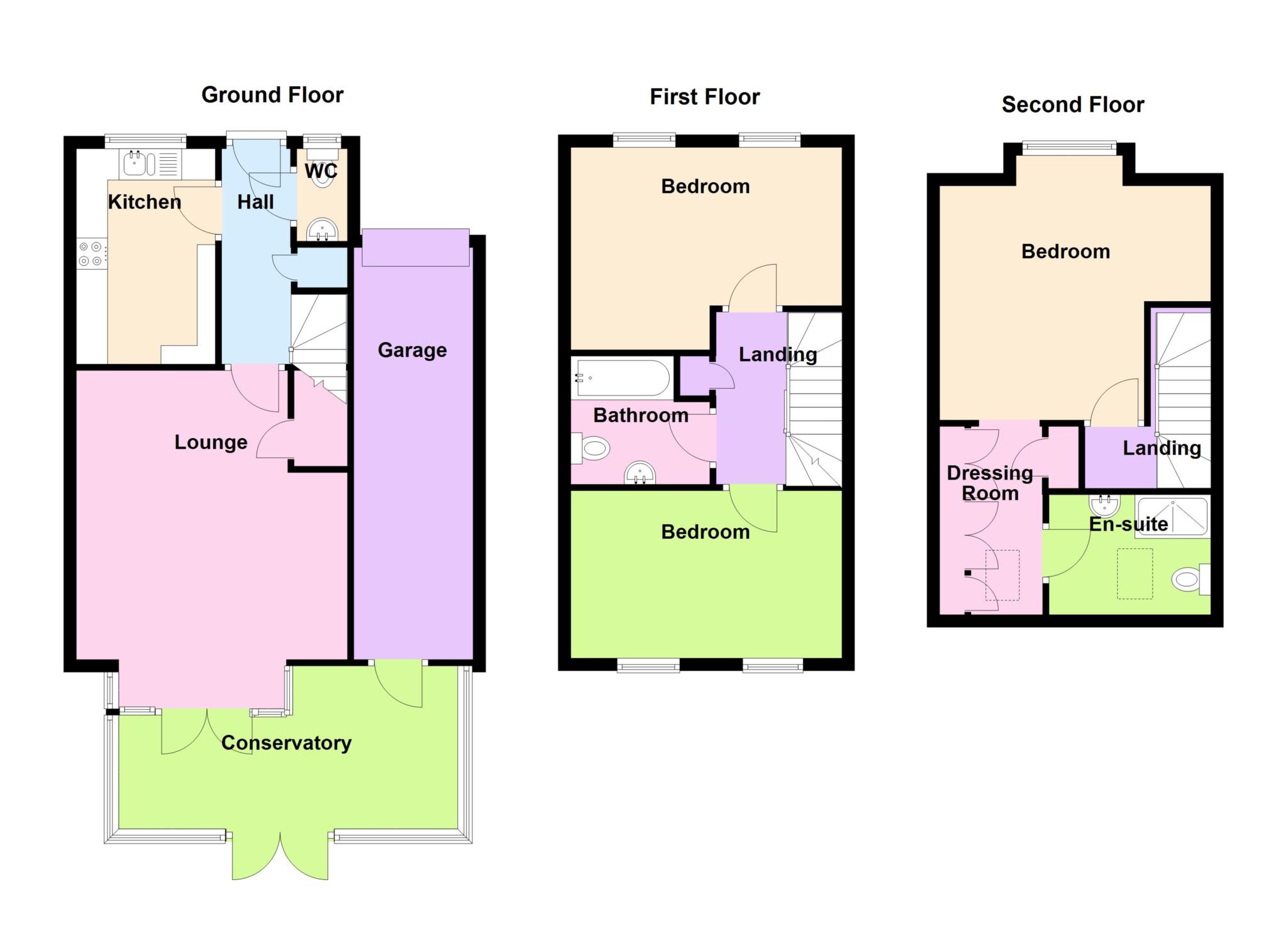 A 3 bed EOT town house with a ground floor lounge, kitchen and conservatory. There is a cloakroom on the ground floor with the family bathroom on the 1st floor and en-suite and dressing room to bedroom 1 on the top floor. Outside is parking to front, sunny aspect rear garden and garage,