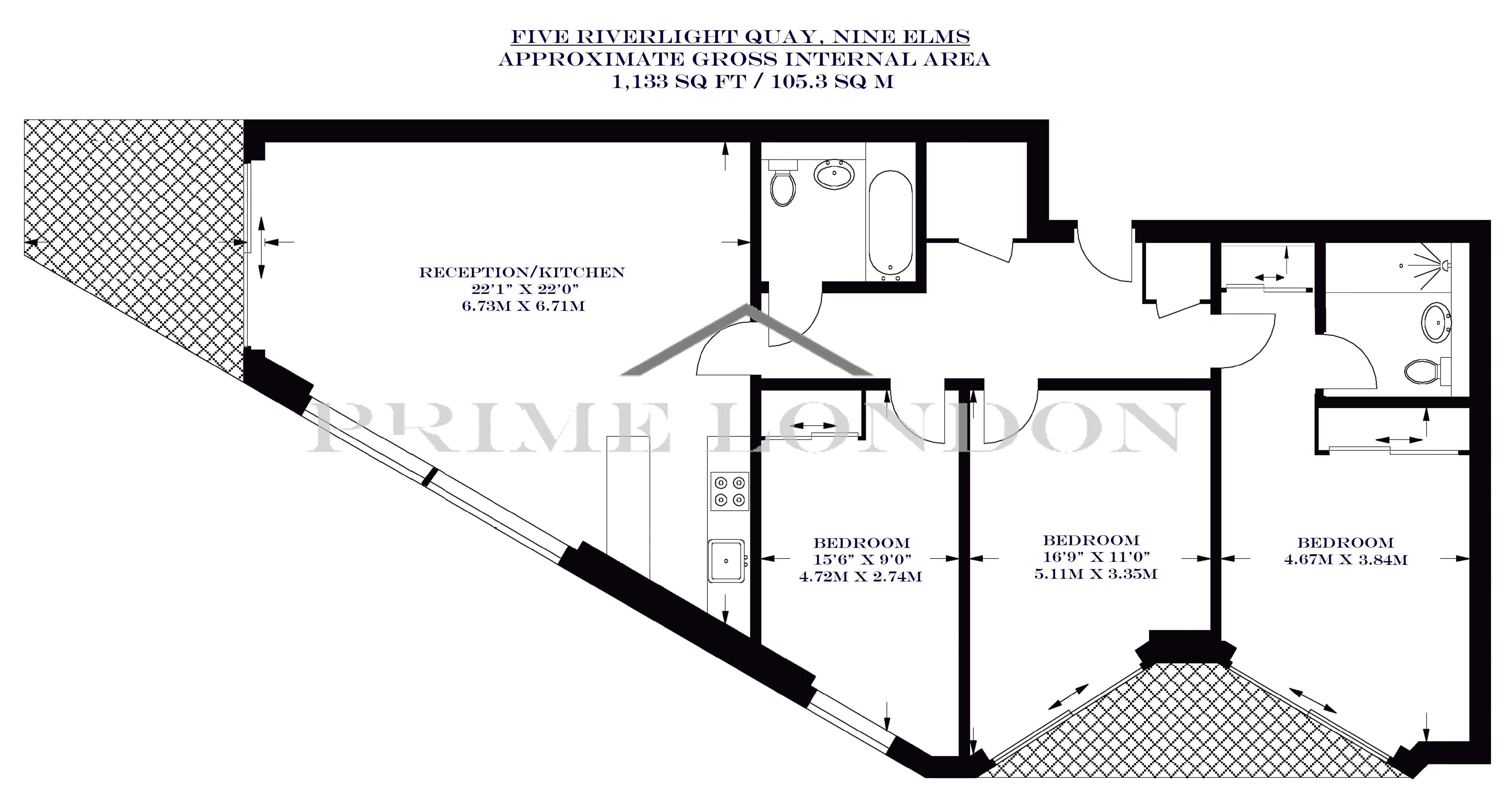 An 1,133 sq ft three bedroom prow style apartment, with an extensive and spacious living space, available for lease through Prime London.