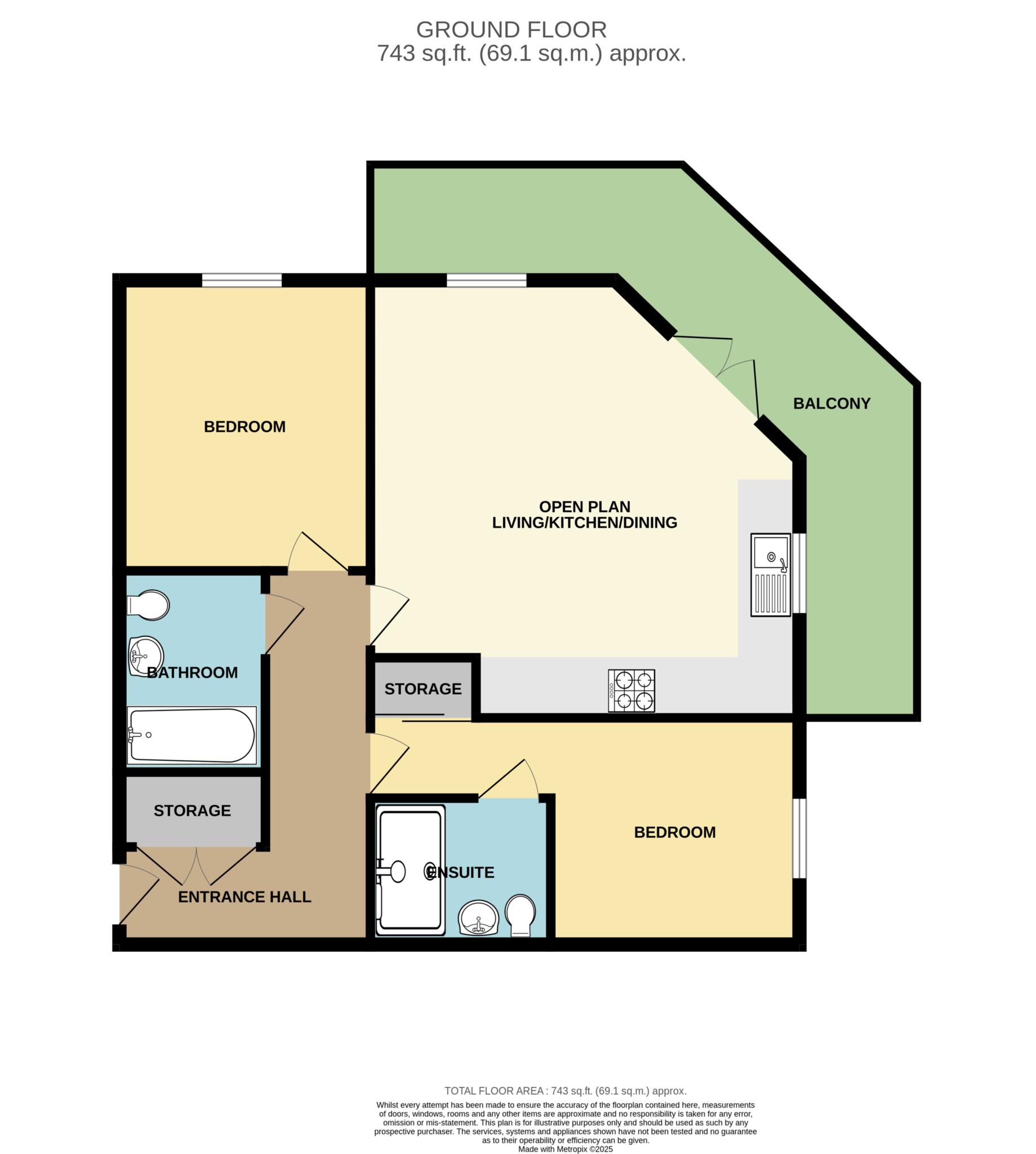 The well proportioned accommodation includes two generous double bedrooms, two bathrooms (including an en-suite to the main bedroom), and a spacious open-plan kitchen/living/dining area. Designed to maximise light and flow, the main living space leads directly onto a private balcony, perfect for enjoying fresh air and elevated views over the neighbouring park.