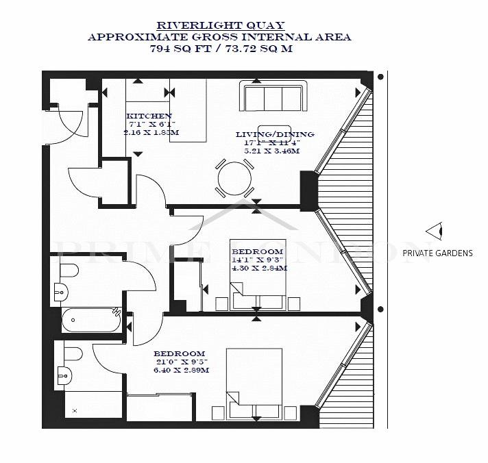 This apartment offers 794 sq ft / 73.72 sq m of living space, two balconies, en suite and dressing area to primary, high specification level throughout, comfort cooling and under floor heating.