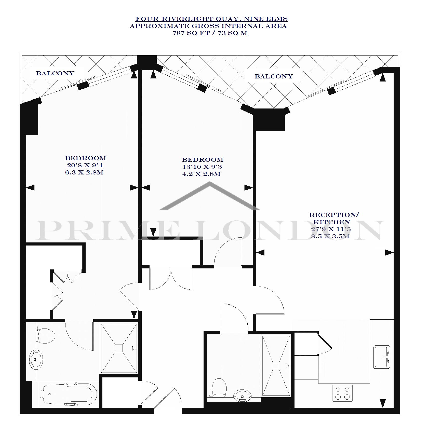 This apartment offers luxurious finishes throughout the 787 sq ft (73 sq m) of living space, two balconies, en suite to master, comfort cooling and under-floor heating.