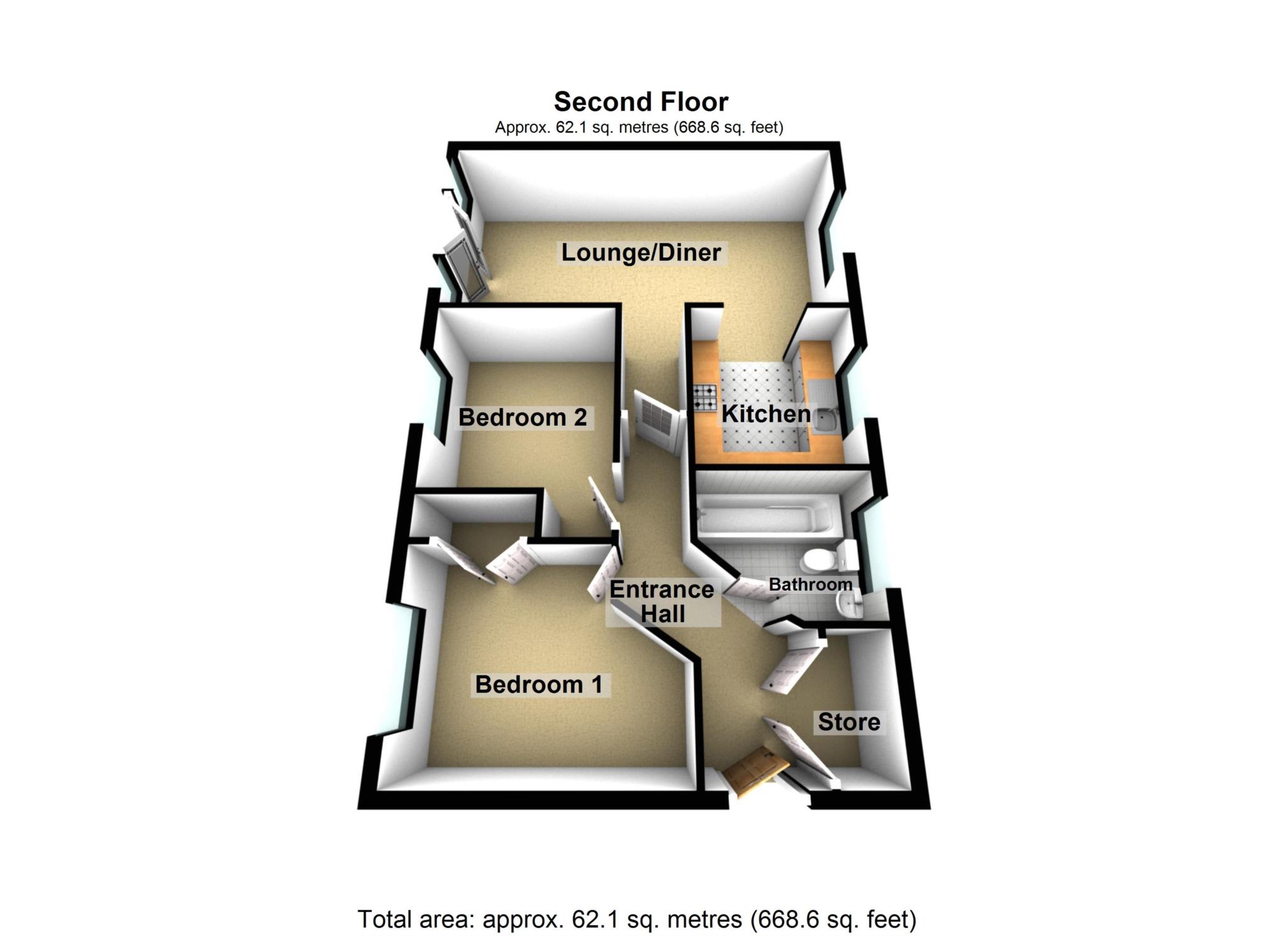 Inside you will find beautifully presented accommodation comprising Entrance Hall (with a large cupboard), stunning Bathroom, 2 double Bedrooms (one of which has a built-in wardrobe), spacious 22ft Lounge /Diner which provides a lovely airy space and is full of natural light (having windows at both ends of the room) and French doors to a Juliet Balcony giving a stunning view of the green nature. The lovely, fitted Kitchen provides you with a built-in oven, hob and extractor and there is also a built-in fridge/freezer.