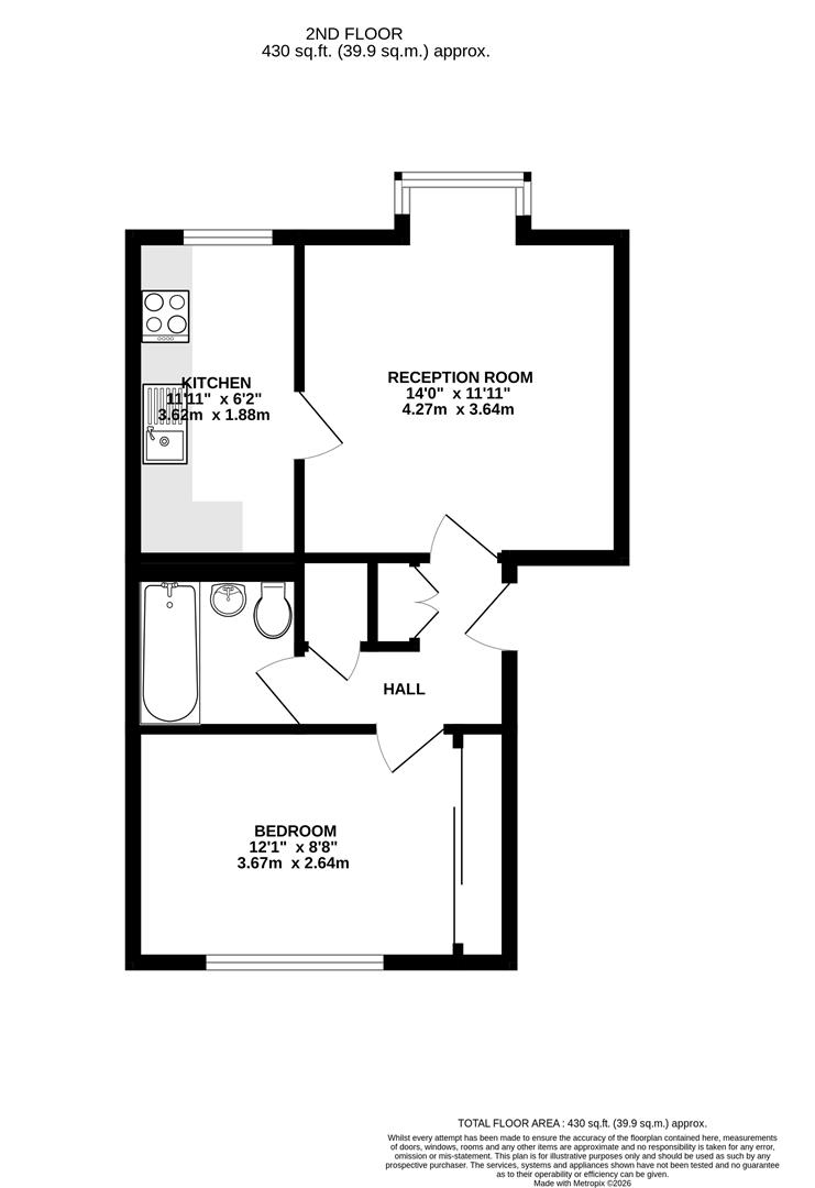Accommodation - Accommodation comprises an entrance hall with useful storage, leading through to a well proportioned reception room measuring approximately 14'0" x 11'11". The separate kitchen is fitted in a practical layout. The bedroom measures approximately 12'1" x 8'8", offering comfortable accommodation, while the bathroom is fitted with a three piece suite. The property extends to approximately 430 sq. ft. overall.