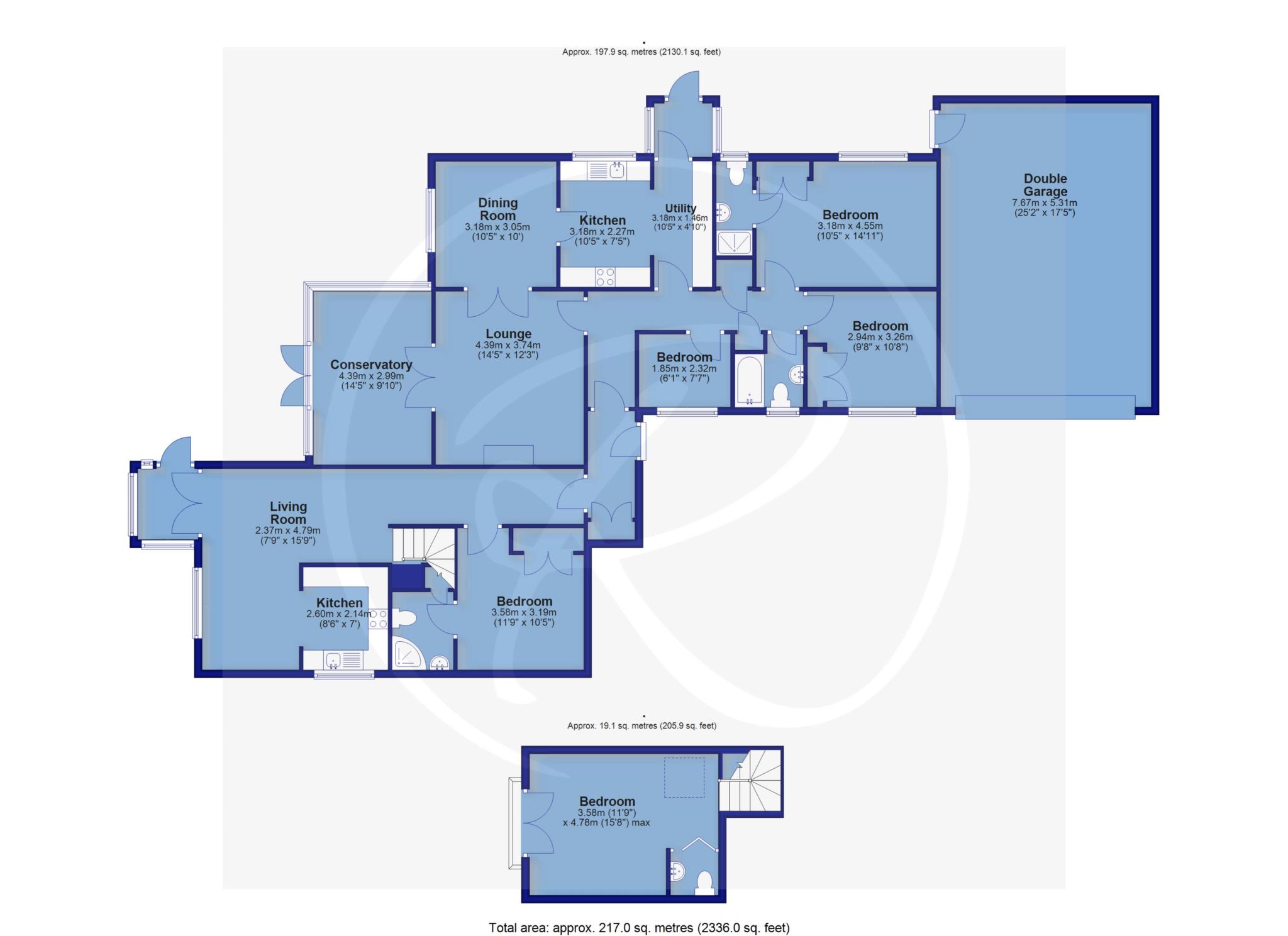 The main bungalow is spacious, light-filled and thoughtfully arranged throughout. It features three well-proportioned bedrooms, including a comfortable principal bedroom with fitted wardrobes and a modern en-suite shower room. The second bedroom also benefits from built-in storage, while the third bedroom, currently used as a single, would equally make an ideal home office or study. The welcoming living room provides a relaxing focal point with its coal-effect gas fire set within a marble insert and hearth, and double doors lead through to a bright conservatory overlooking the fully enclosed rear garden a perfect place to unwind while enjoying the garden views.