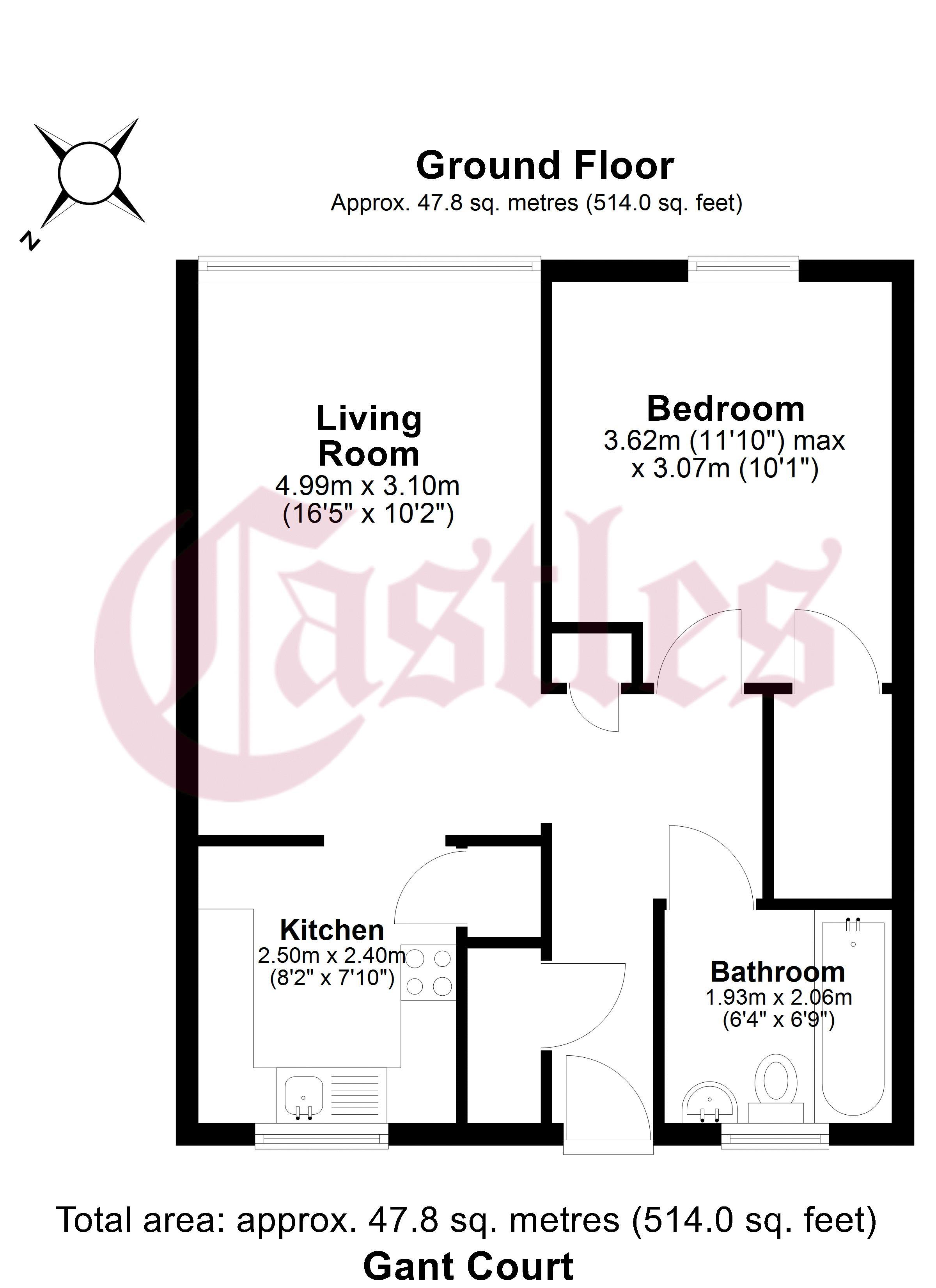 The property offers approximately 47.8 sq. metres (514 sq. ft.) of living space, comprising a spacious living room, separate fitted kitchen, good-sized double bedroom, and a modern bathroom. The layout is practical and well-proportioned, with all rooms accessed from the entrance hallway.