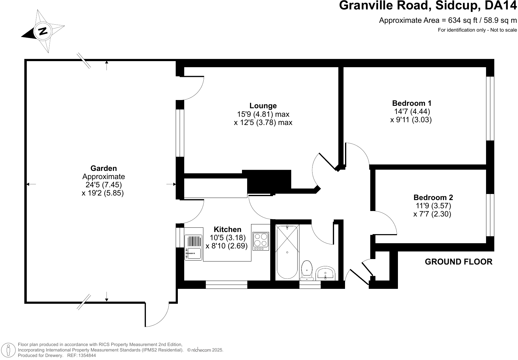 The property briefly comprises: Private entrance, entrance hall with storage, a living room and rear kitchen both with access to the rear garden, two good sized bedrooms and a bathroom. Externally there are front and rear gardens as well as a garage en bloc.