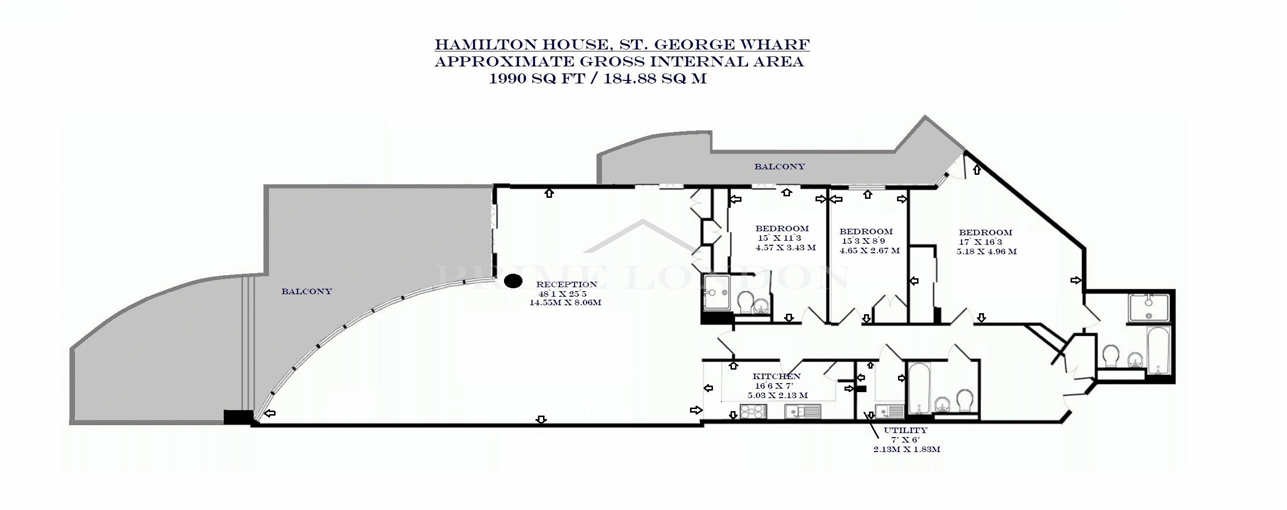 This stunning three bedroom prow apartment of 1,990 sq ft (184.88 sqm), with a huge private terrace overlooking the River Thames as well as a further private balcony, is available to rent through Prime London in the excellently located and well-served riverside development, St George Wharf. The property comes unfurnished.